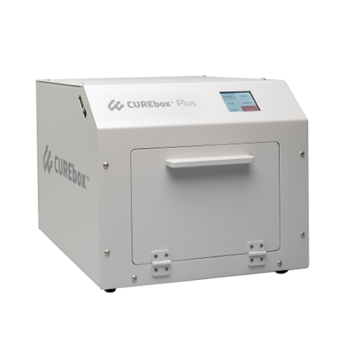 UV is justpart of what it takes to get a good cure. Often overlooked is temperature.CUREbox has temperature control to give you the absolute best properties fromyour SLA part. Curing doesn't even start until the chamber reaches temperature.No need to wait for the chamber to reach temperature, CUREbox will wait foryou. CUREbox Plus has improved heating technology, bringing the chamber up totemperature 4X faster than CUREbox.