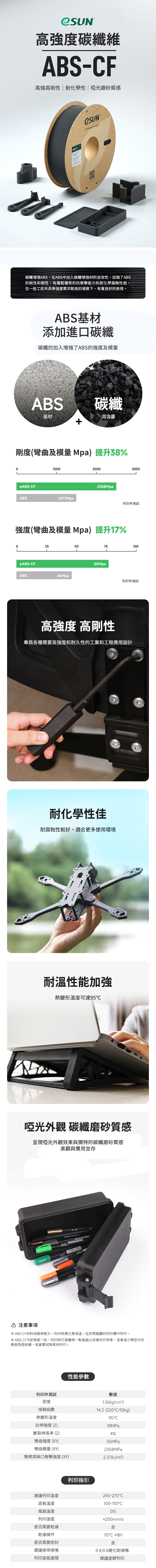 在ABS中加入碳纖增強材料並改性,加強了ABS的剛性和韌性,有著較優秀的抗衝擊能力和耐化學腐蝕性能,在一些工裝夾具等強度需求較高的場景下,有著良好的表現。
