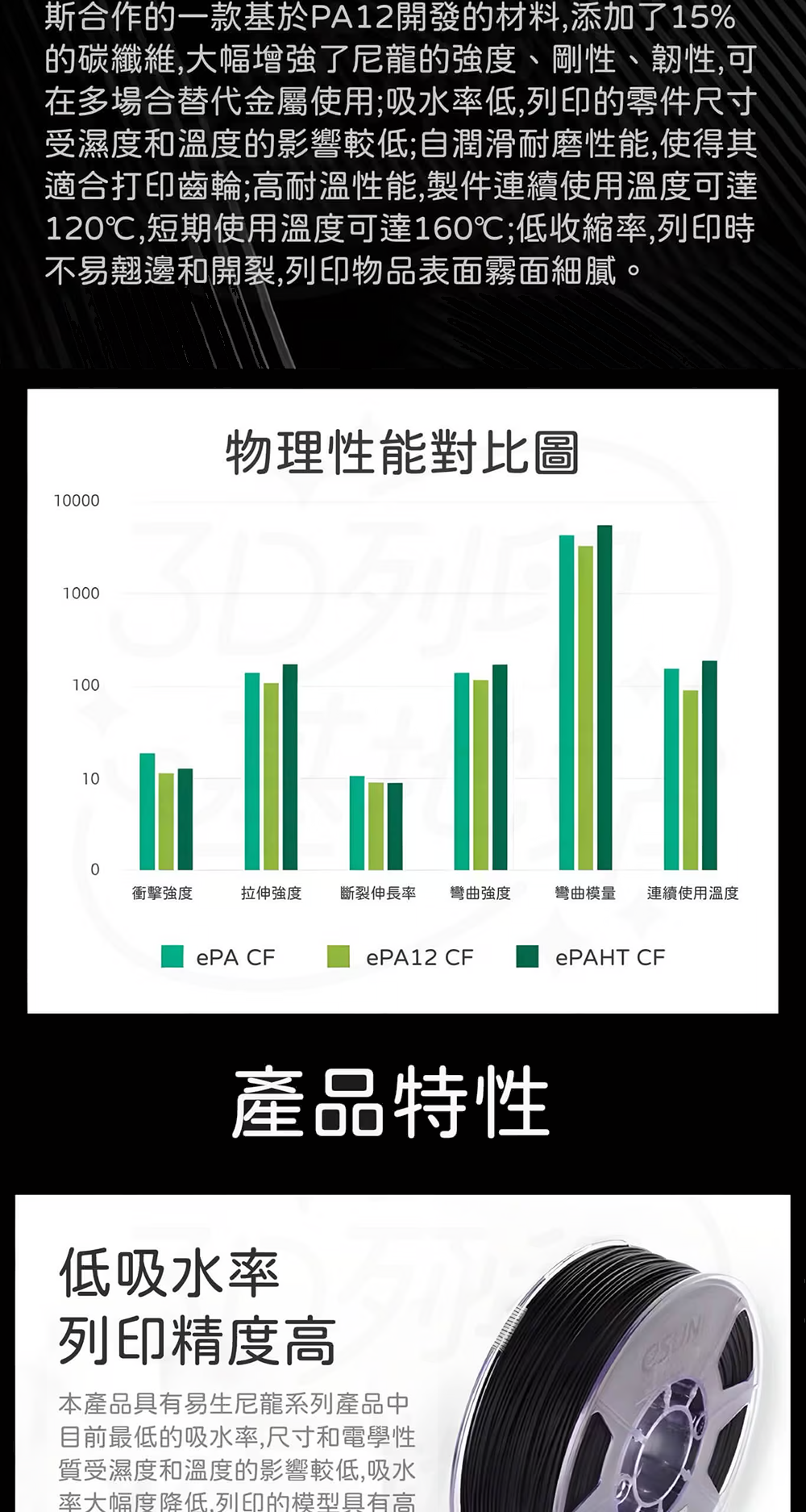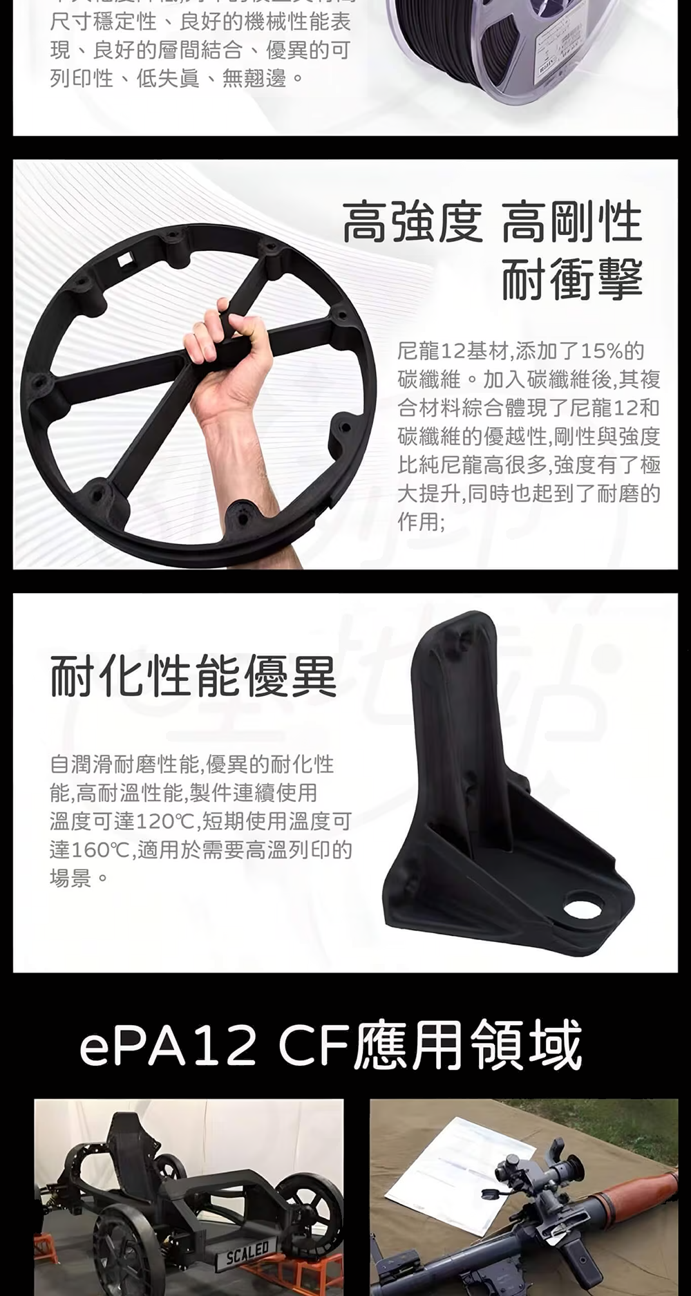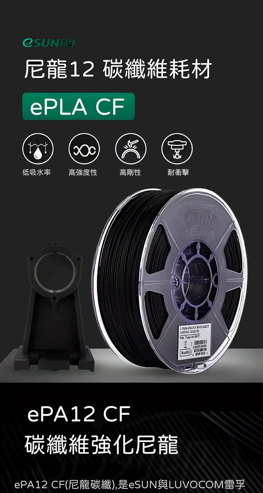 eSUN與LUVOCOM雷孚斯合作的一款基於PA12開發的材料,添加了15%的碳纖維,大幅增強了尼龍的強度、剛性、韌性,可在許多場合替代金屬使用;吸水率低,列印的零件尺寸受濕度及溫度的影響較低;自潤滑耐磨性能,使得其適合列印齒輪;高耐溫性能,製件連續使用溫度可達120℃,短期使用溫度可達160℃;低收縮率,列印時 不易翹邊和開裂,列印物品表面霧面細膩。