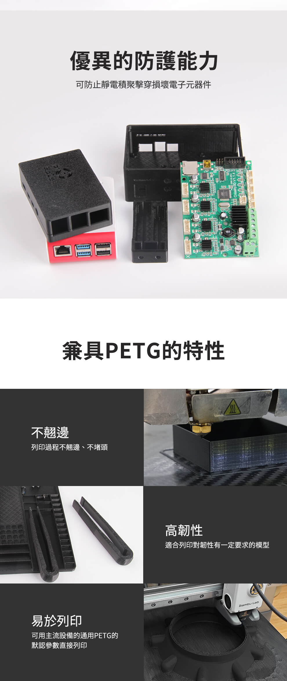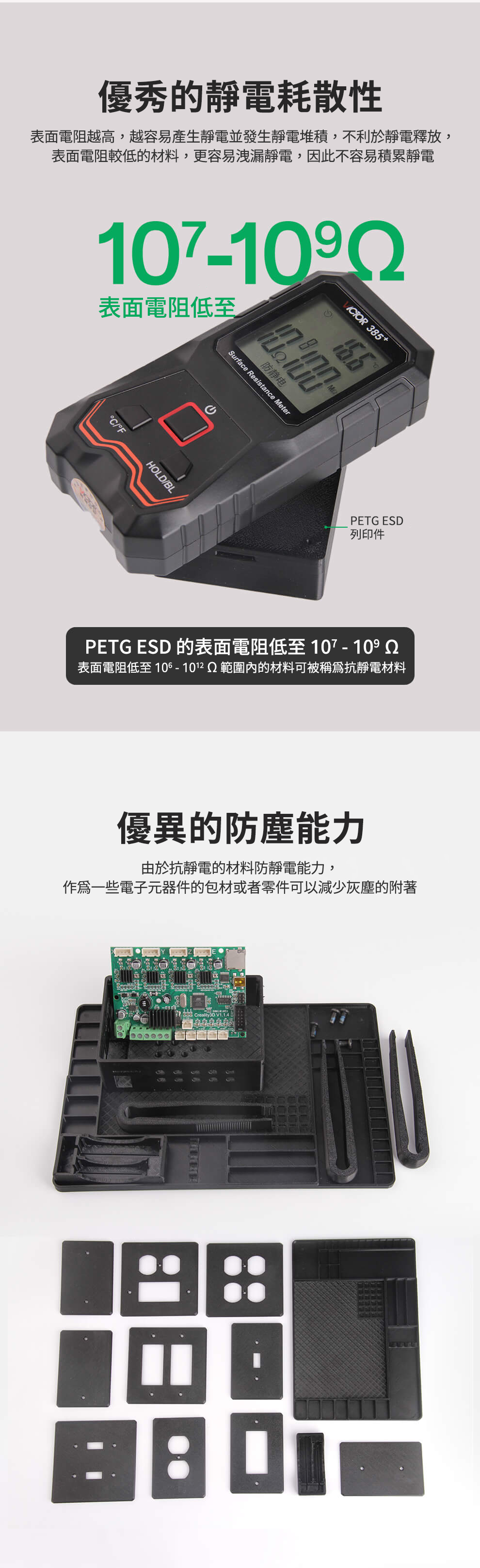 eSun PETG ESD 抗靜電線材具備優異的抗靜電性能,能有效防止靜電積聚並保護電子元件,成品表面光滑細膩,兼具強度與韌性,特別適合應用於電子產品外殼、工業治具與功能性零件,提供穩定可靠的專業級列印體驗。