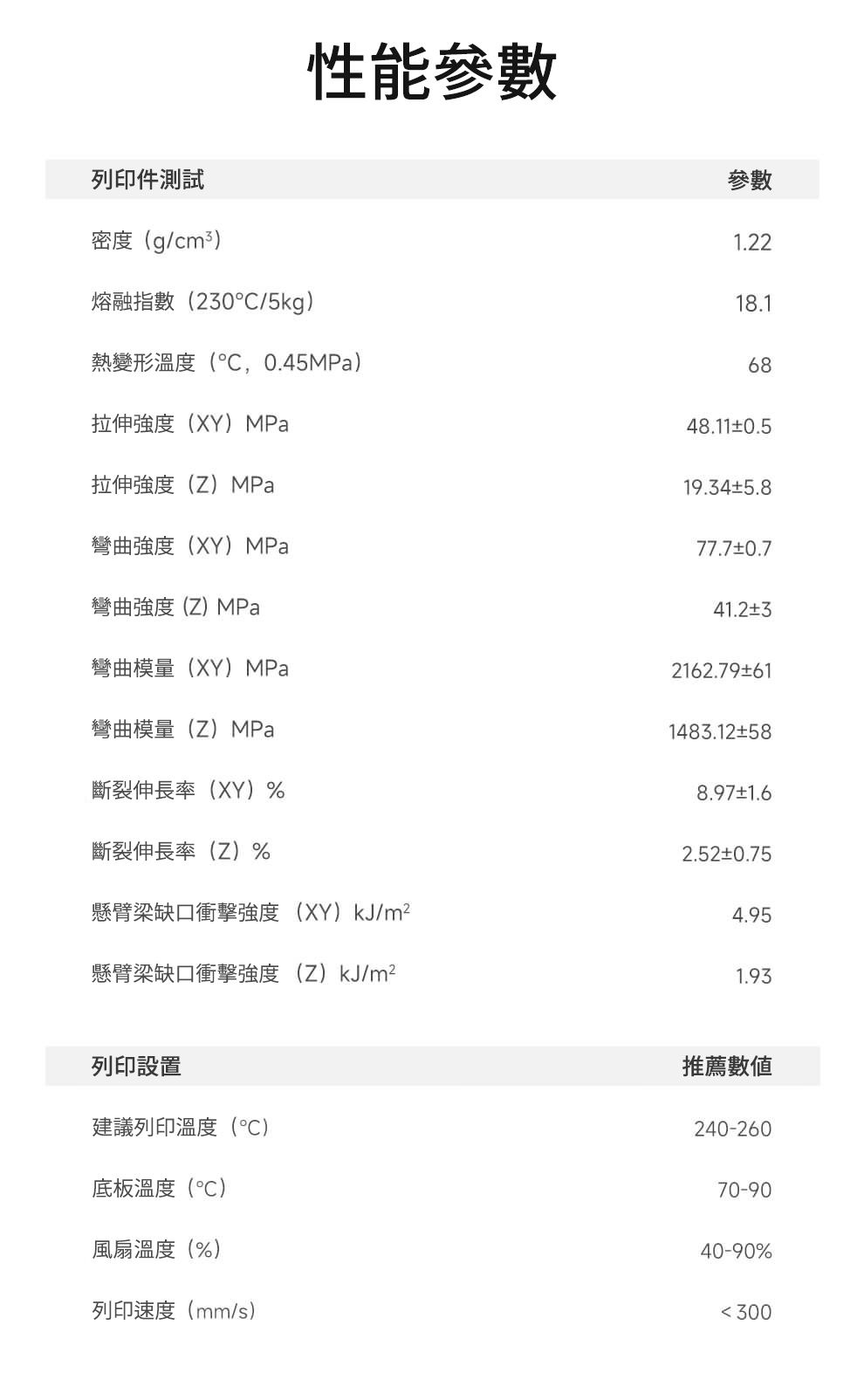 ▫︎ 懸臂梁缺口衝擊強度IZOD Impact Strength(kJ/m²):XY 4.95;Z 1.93
