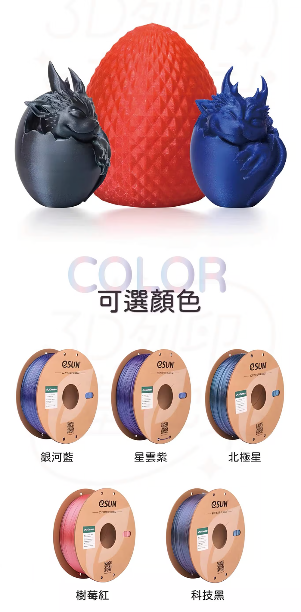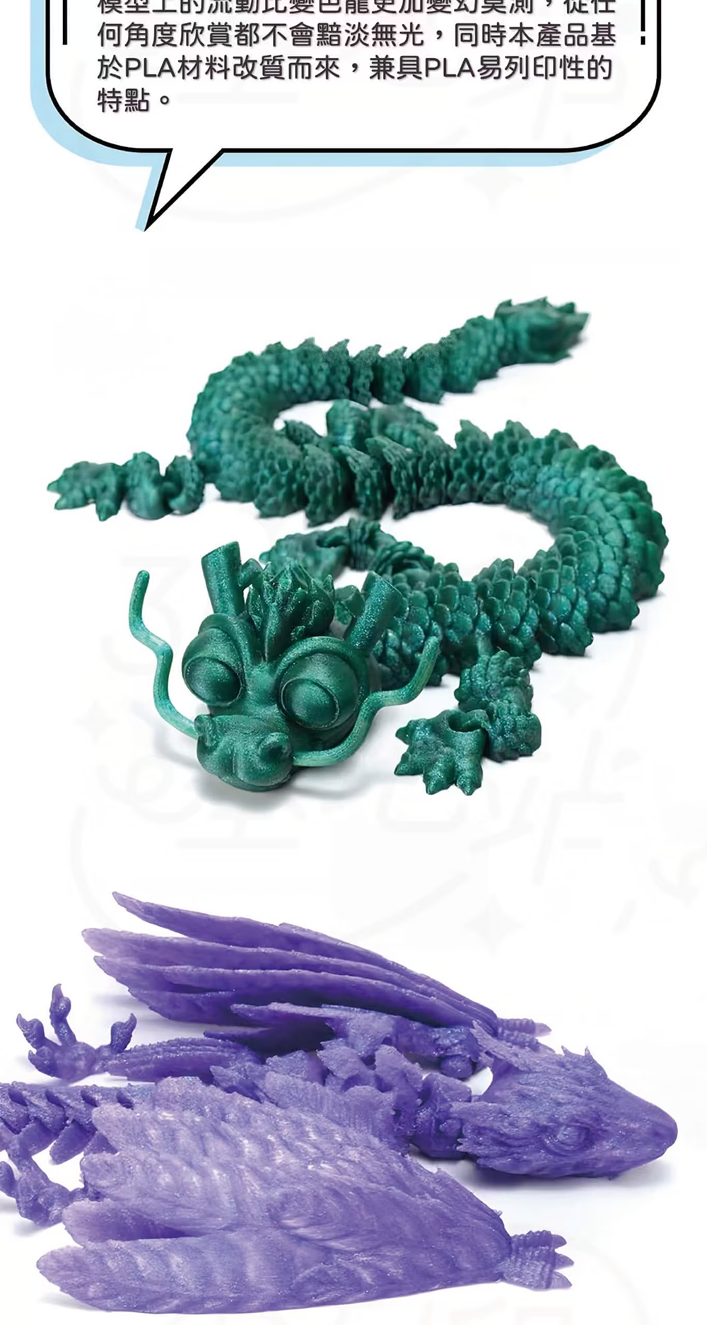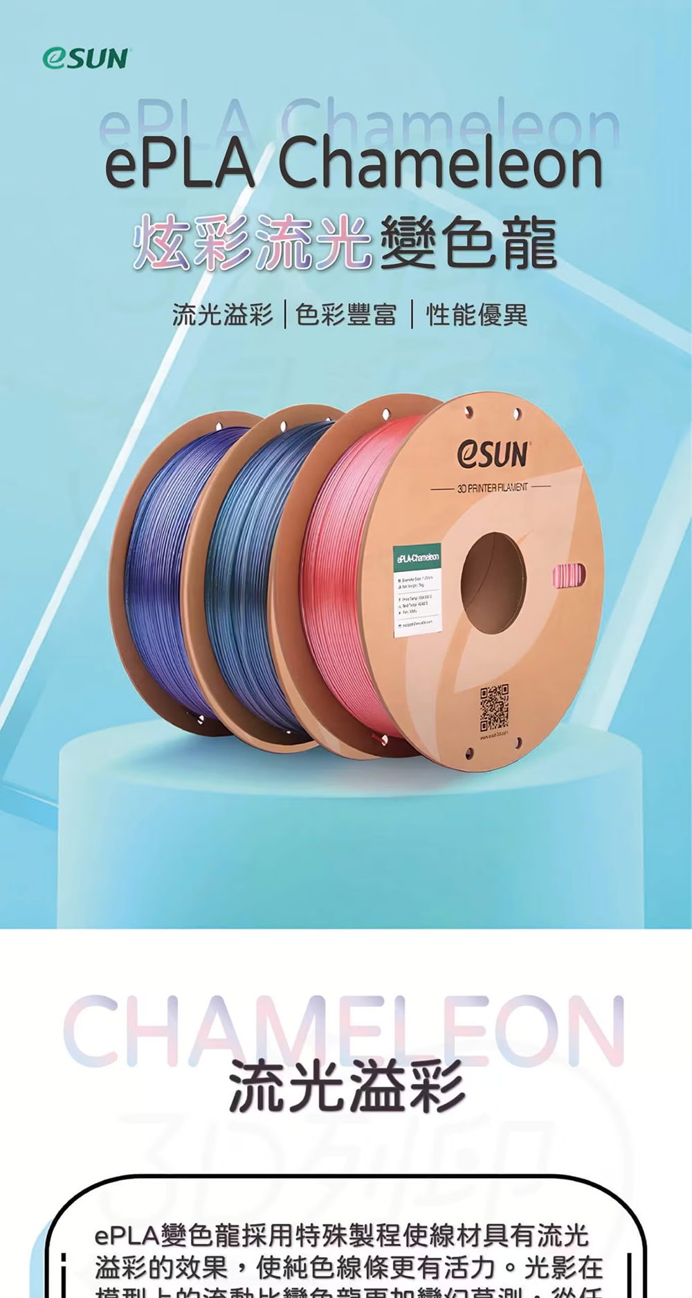 ePLA變色龍採用特殊工藝使線材具有流光溢彩的效果,使純色線條更具活力。 光影在模型上的流動比變色龍更加變幻莫測,從任何角度欣賞都不會黯淡無光,同時該產品基於PLA材料改性而來,兼具PLA易列印性的特點。