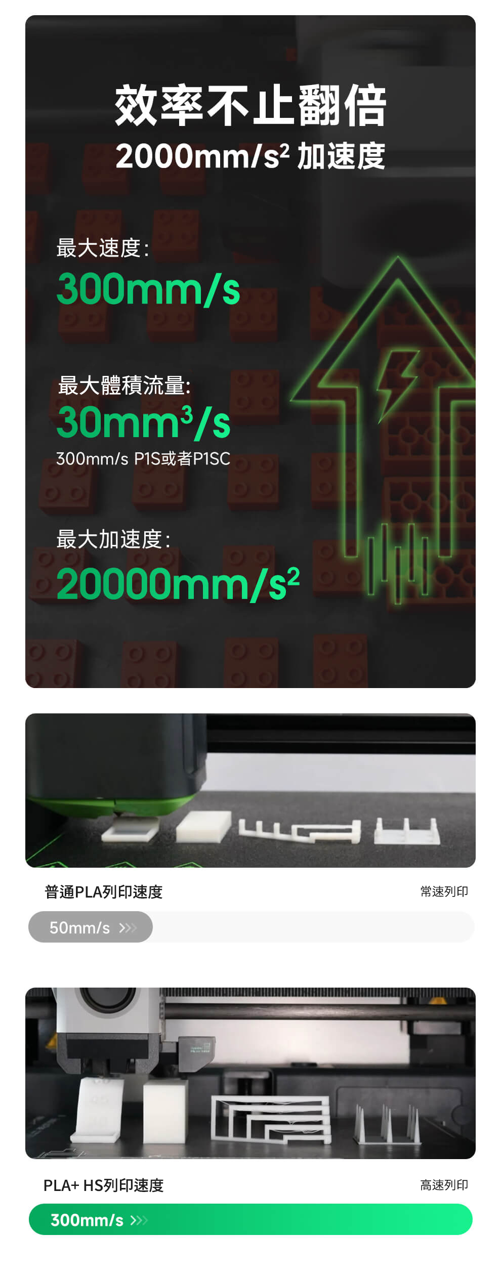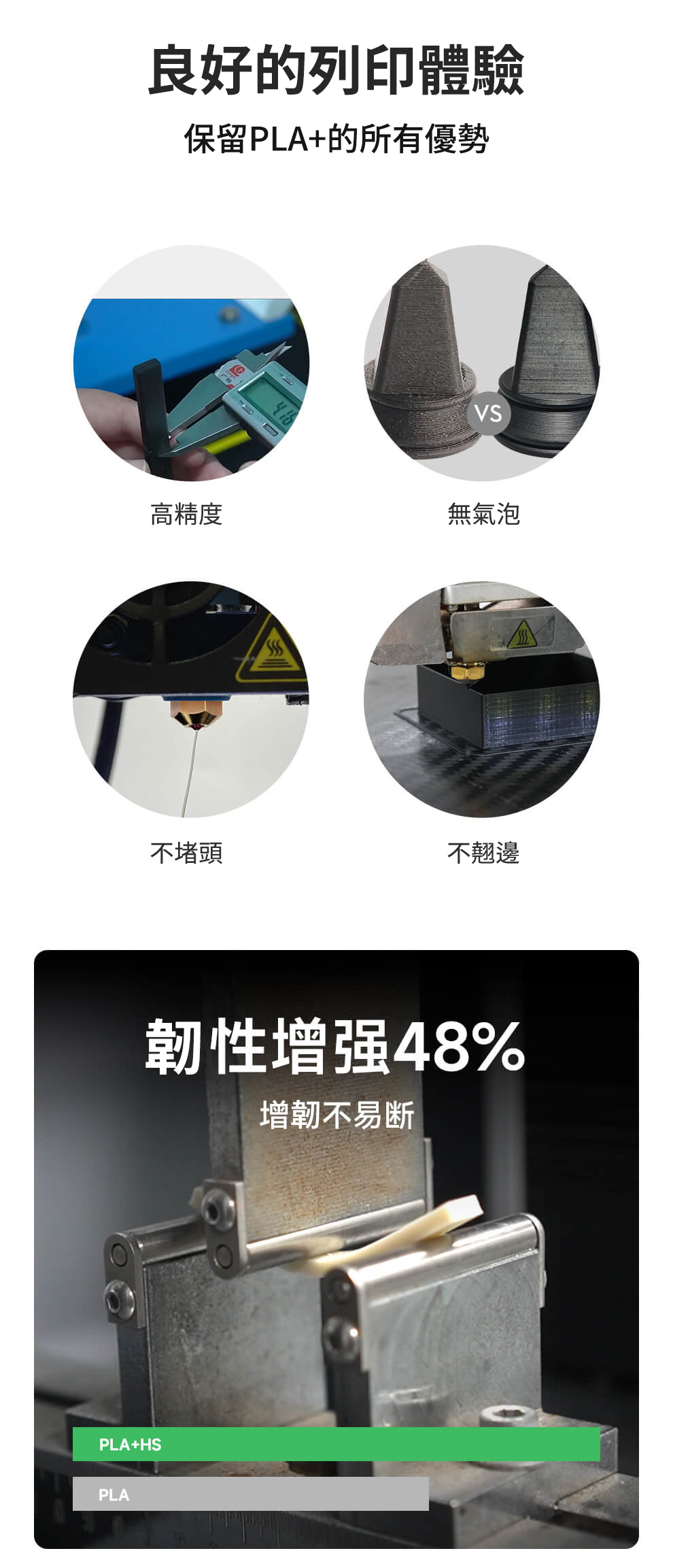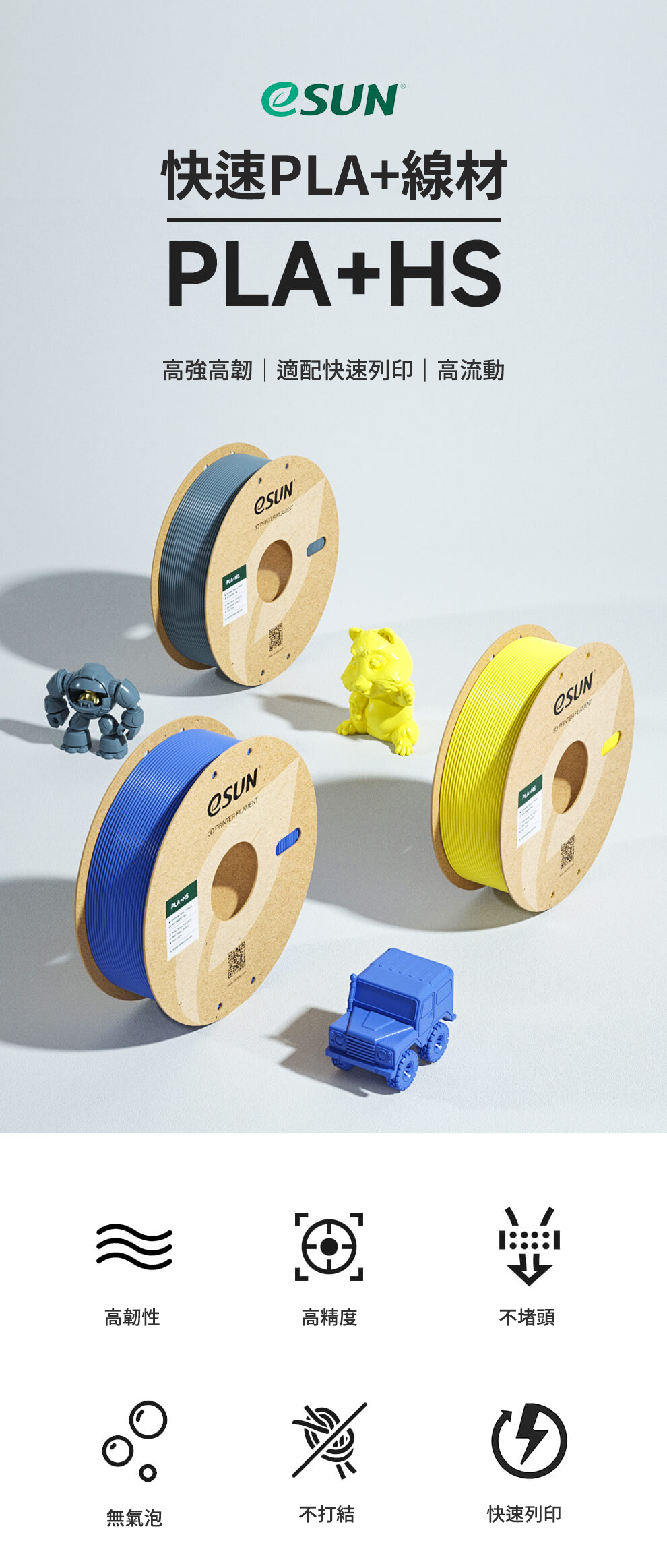 PLA HS 快速列印要求材料快熔快冷,為了平衡材料熔融和冷卻的速度,一般在快速列印下線材的物理性能都會下降。 為了給予列印品在快速列印下更優的機械性能,透過在眾多款快速配方中不斷測試,針對性地篩選出了ePLA+ HS,兼顧了熱門產品PLA+的特性,同時擁有高速列印性能。
