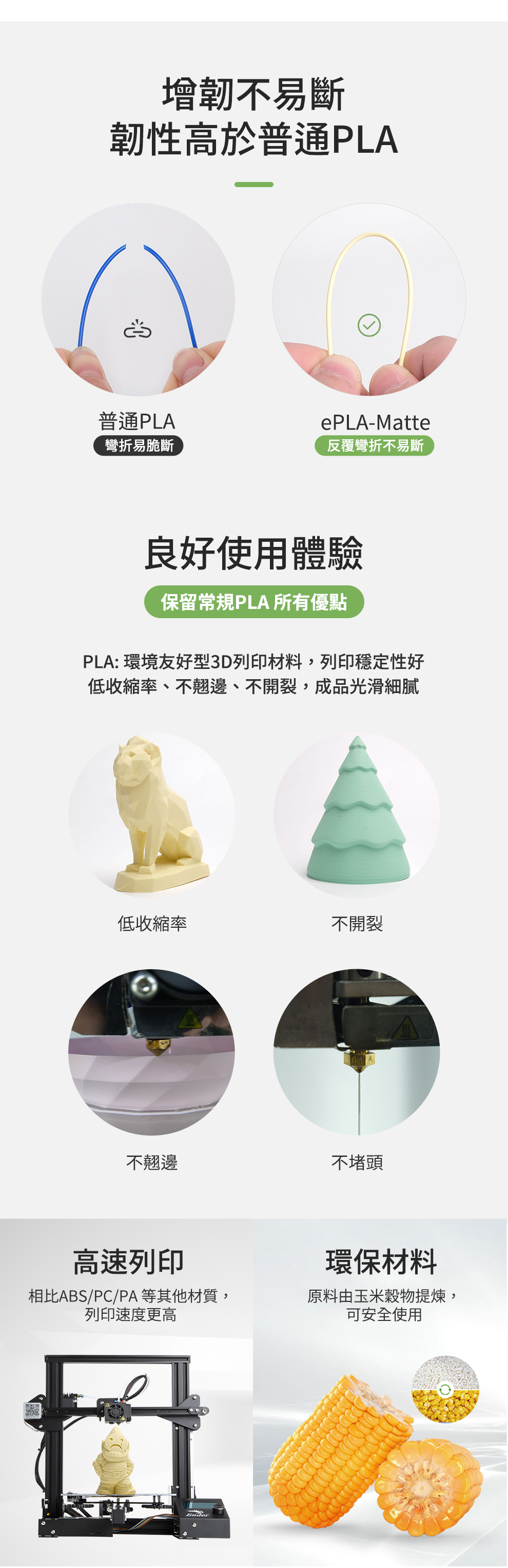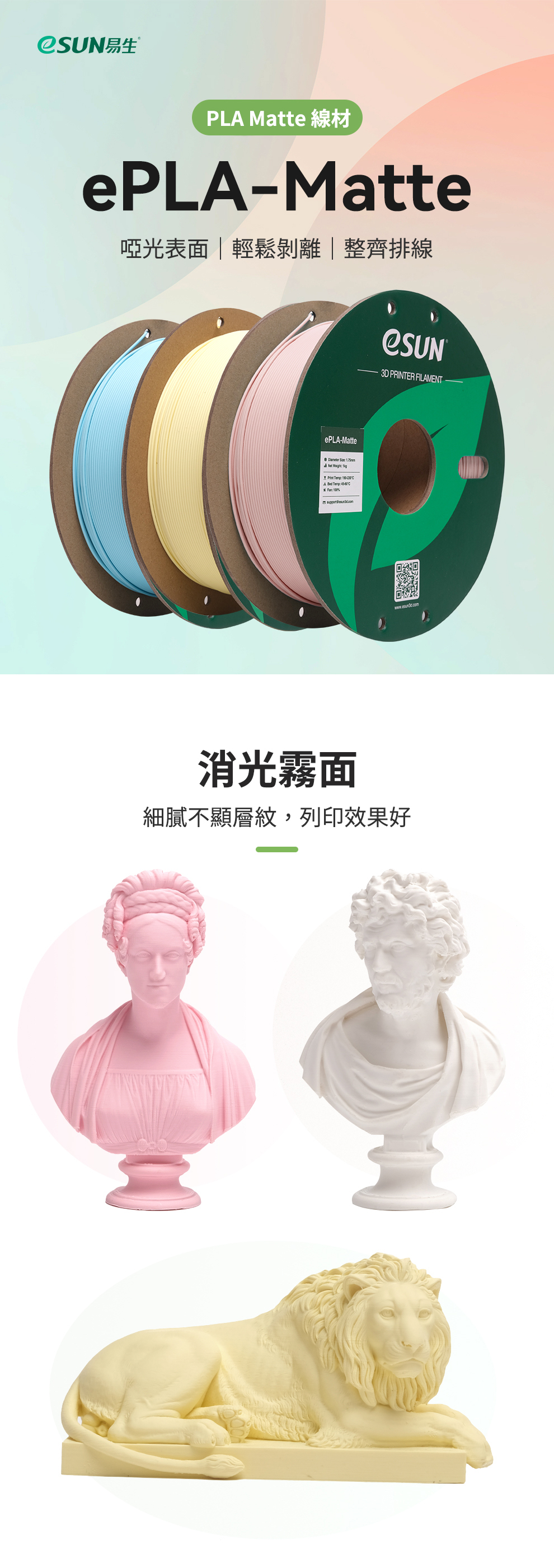 PLA Matte是一款高性價比的PLA材料,屬於環境友好型材料易於列印。 ePLA-Matte與ABS相比,無需封閉腔體,低收縮率,不翹邊,不開裂,可以列印大尺寸的模型;支撐相比其他材料,更容易從模型表面剝離,接觸面表面光滑平整;列印時不會有刺激性氣味,安全環保;線盤基於PETG、ABS、PLA等生產廢料和工業廢料重新利用注塑而成,外盒採用可回收紙盒,環保理念,使3D列印更具可持續性;啞光錶面效果,表面細膩不顯層紋;線條不易脆斷,長時間列印順暢不堵頭,可用於早期概念模型、快速原型製作。低密度,ePLA Matte單卷單卷耗材較其他啞光PLA產品列印模型多21%。