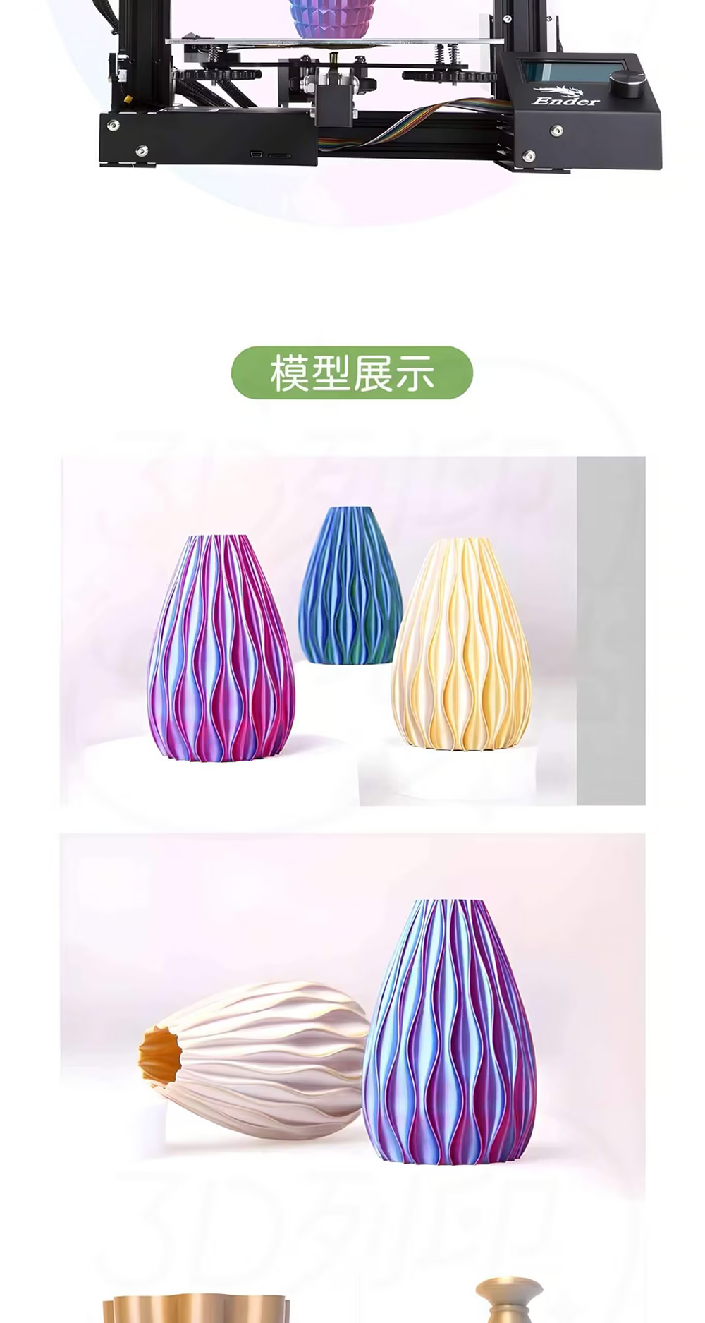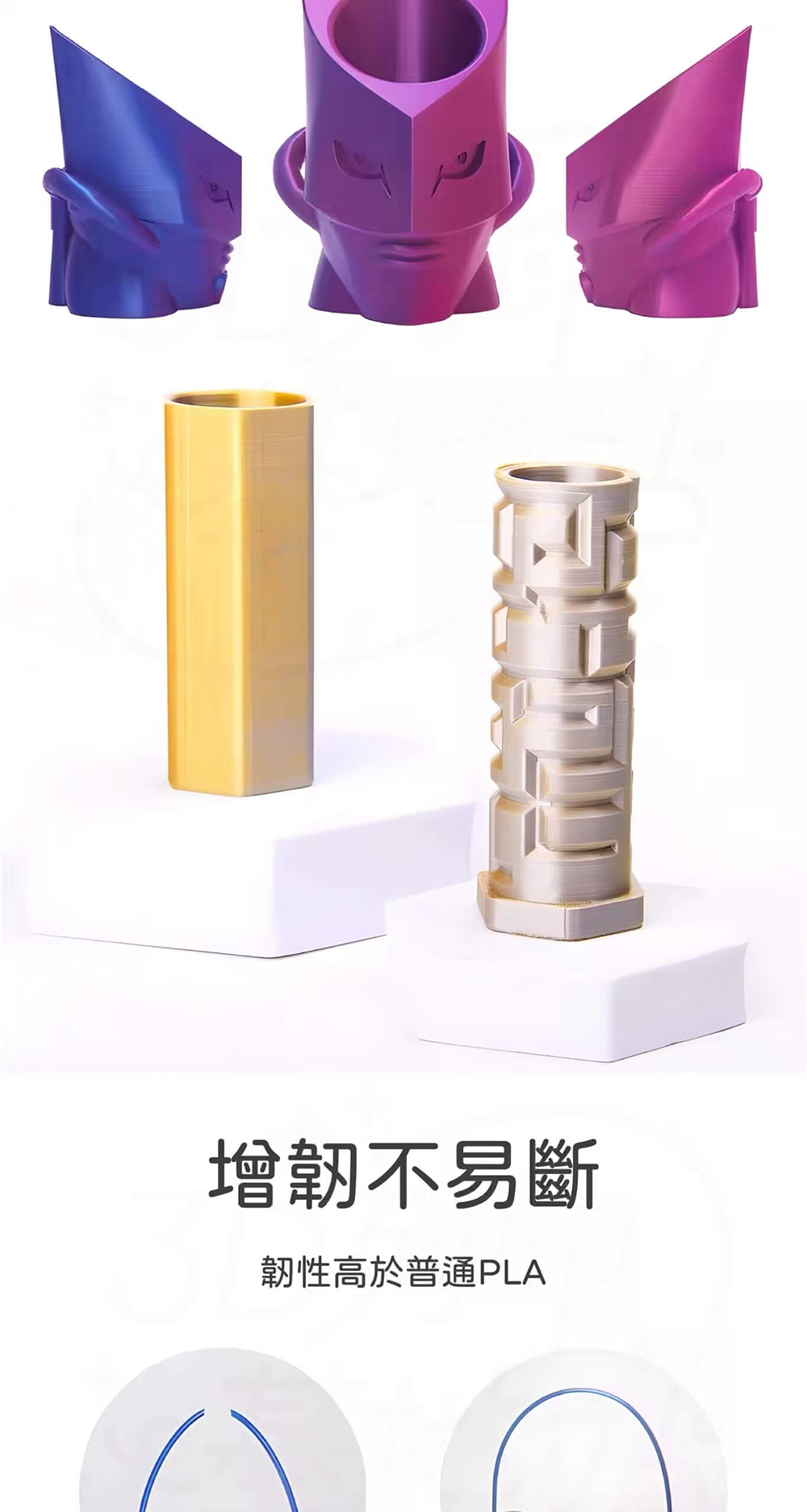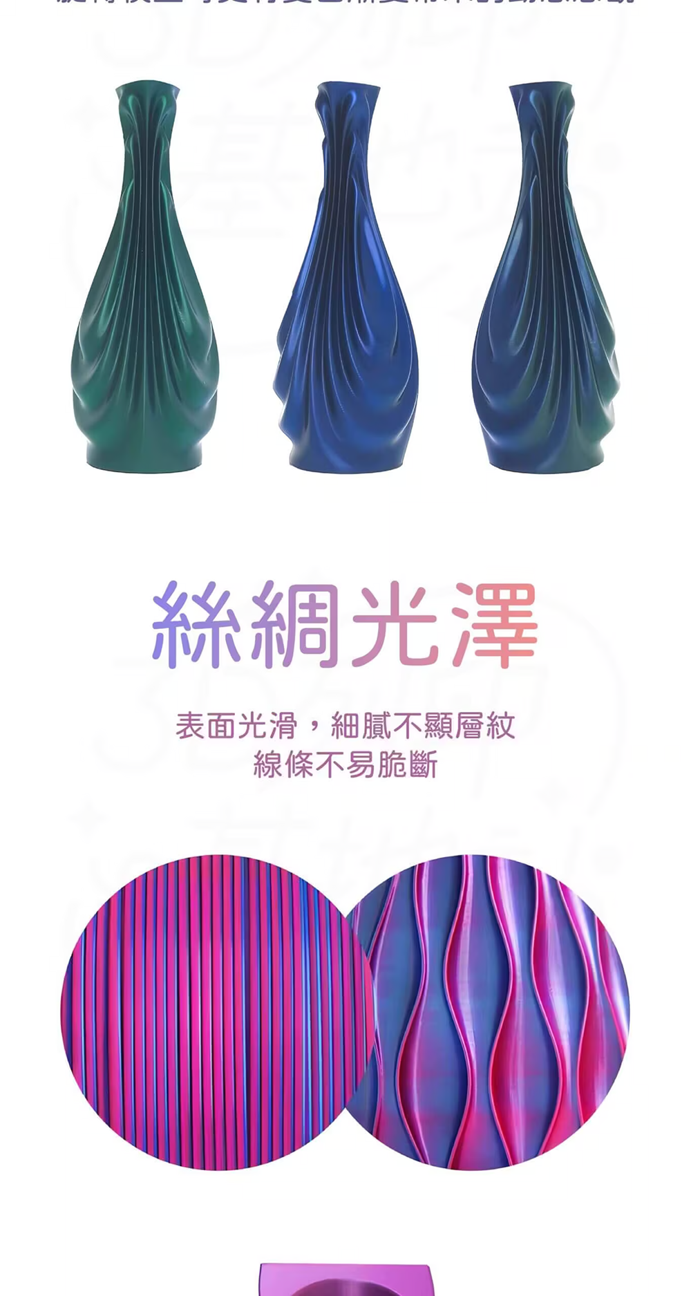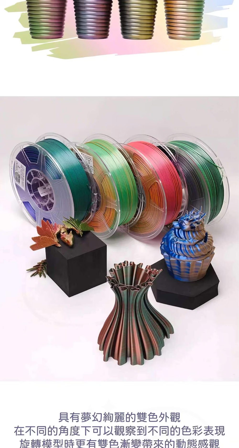 模型具有夢幻絢麗的雙色外觀,在不同的角度下可以觀察到不同的色彩表現,旋轉模型時更有雙色漸變帶來的動態感觀,外觀富有絲綢光澤質感,表面光滑不顯層紋;支撐相比其他材料,更容易從模型表面剝離,接觸面表面光滑平整;該產品基於PLA材料改性而來,具有PLA易列印性的特性。