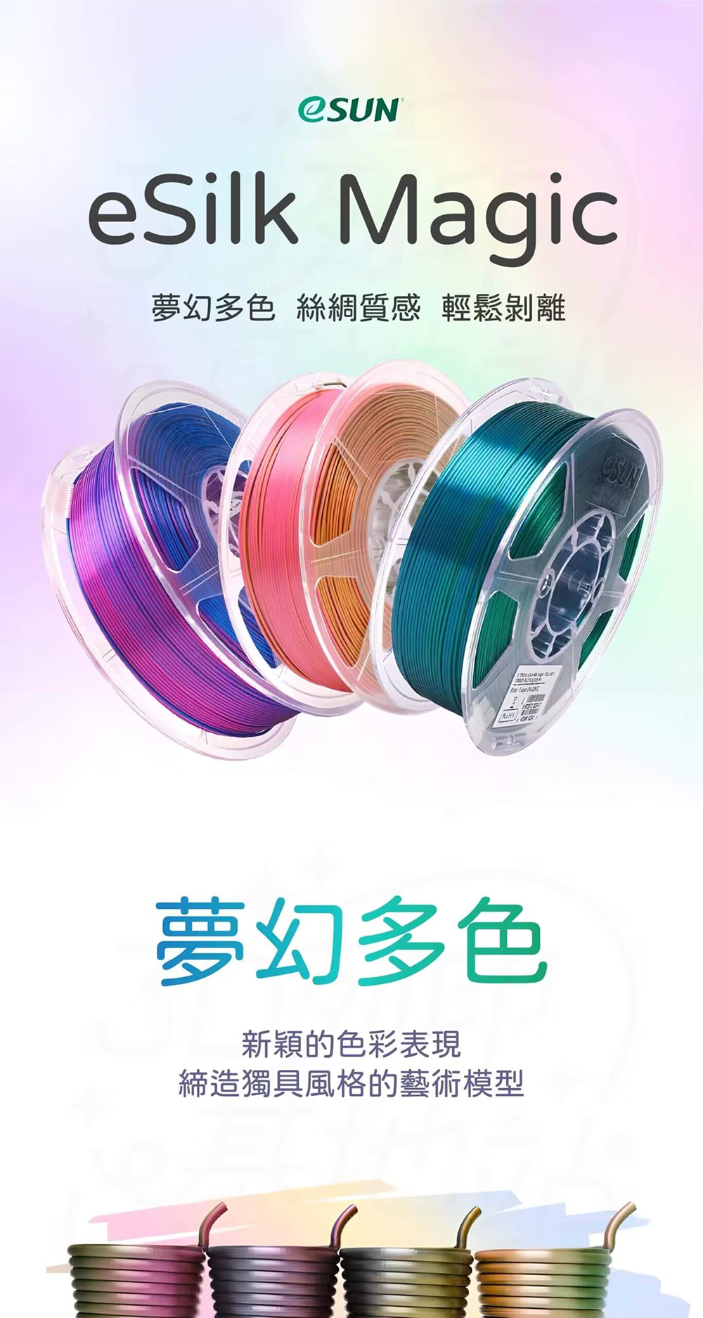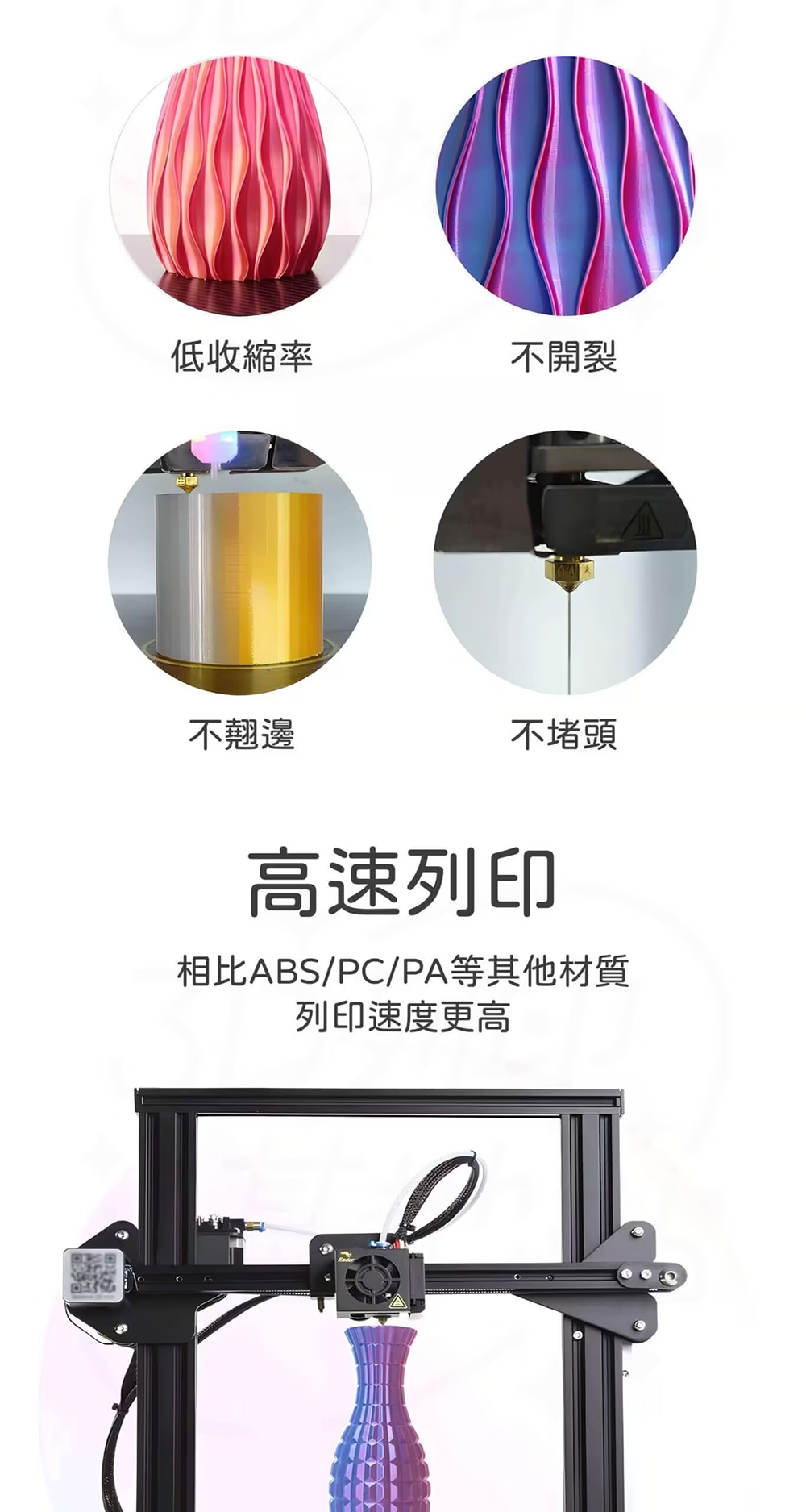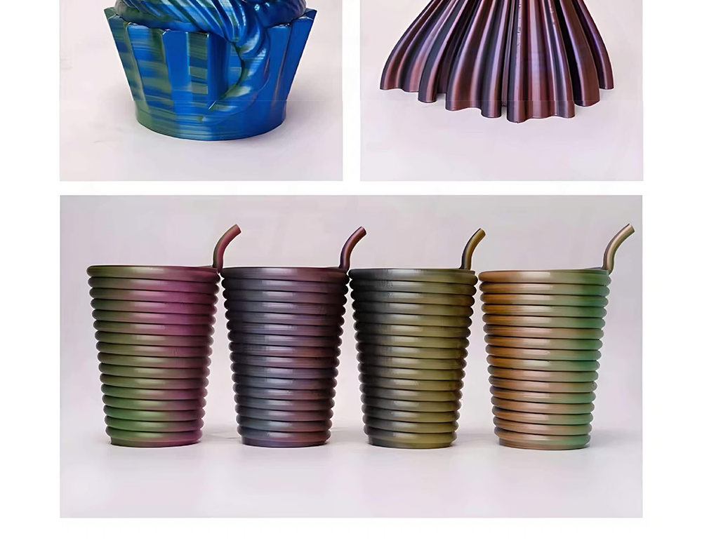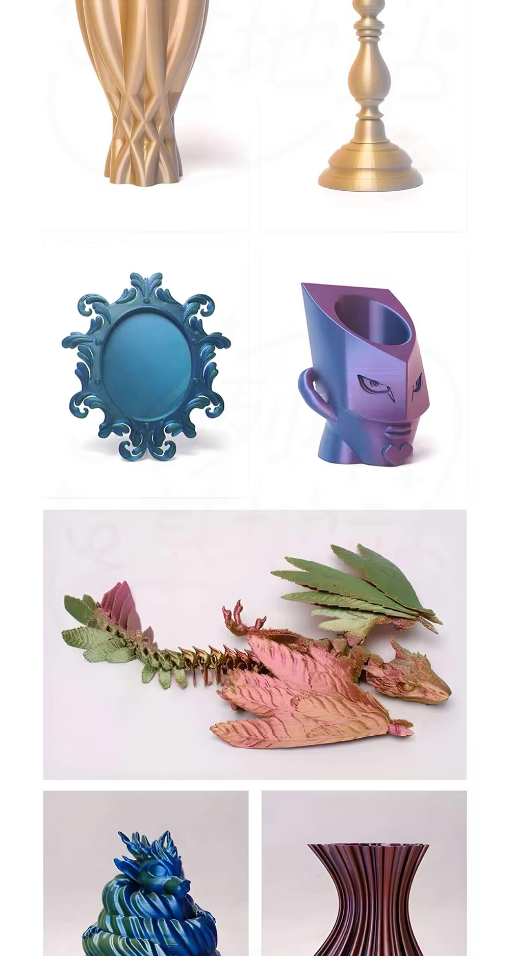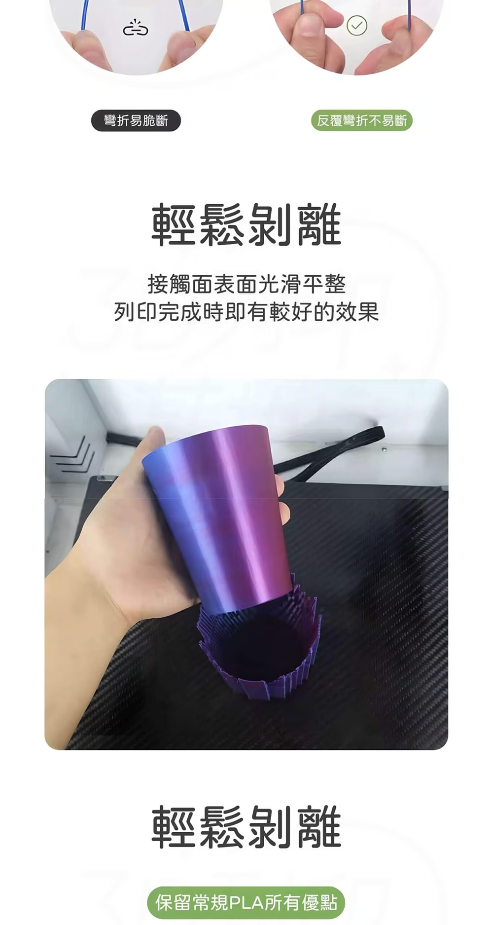 模型具有夢幻絢麗的雙色外觀,在不同的角度下可以觀察到不同的色彩表現,旋轉模型時更有雙色漸變帶來的動態感觀,外觀富有絲綢光澤質感,表面光滑不顯層紋;支撐相比其他材料,更容易從模型表面剝離,接觸面表面光滑平整;該產品基於PLA材料改性而來,具有PLA易列印性的特性。