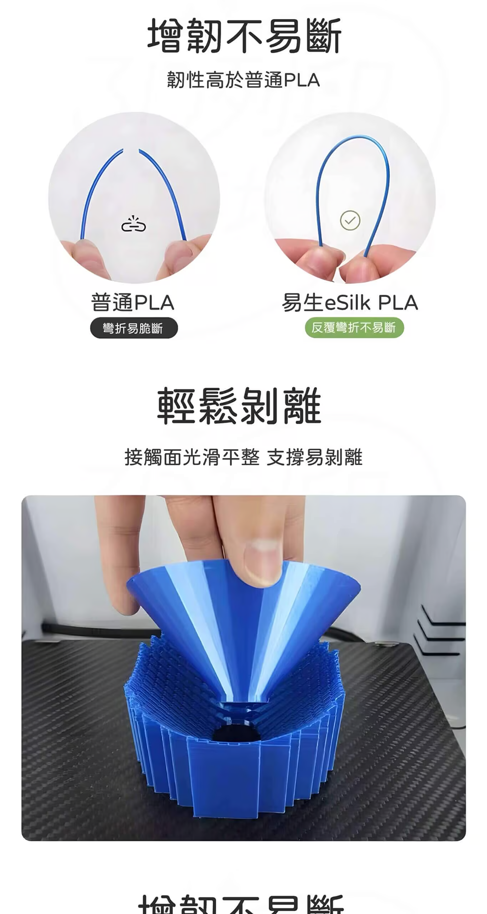 一線三色,豐富的橫向色彩搭配使得列印模型充滿神秘感,每次列印都能在不同的角度下觀察到豐富的色彩組合表現,置於掌中旋轉模型更有三色交織漸變帶來的奇妙動態感觀,外觀富有絲綢光澤質感,表面光滑不顯層紋;支撐相比其他材料,更容易從模型表面剝離,接觸面表面光滑平整;該產品基於PLA材料改性而來,具有PLA易列印性的特點。
