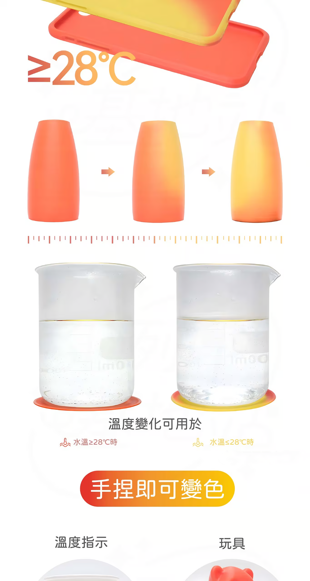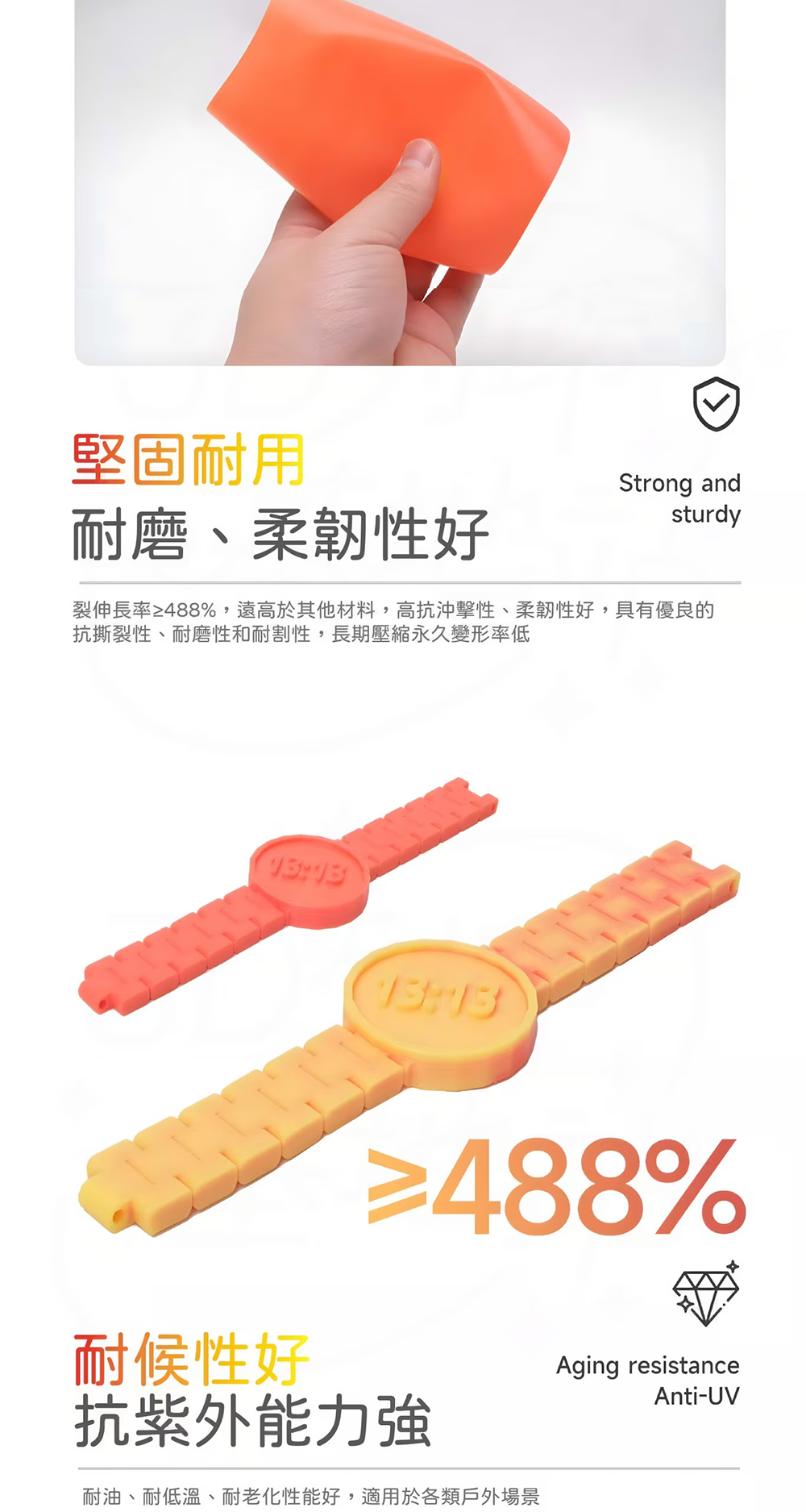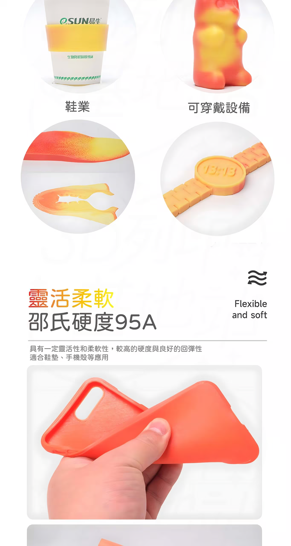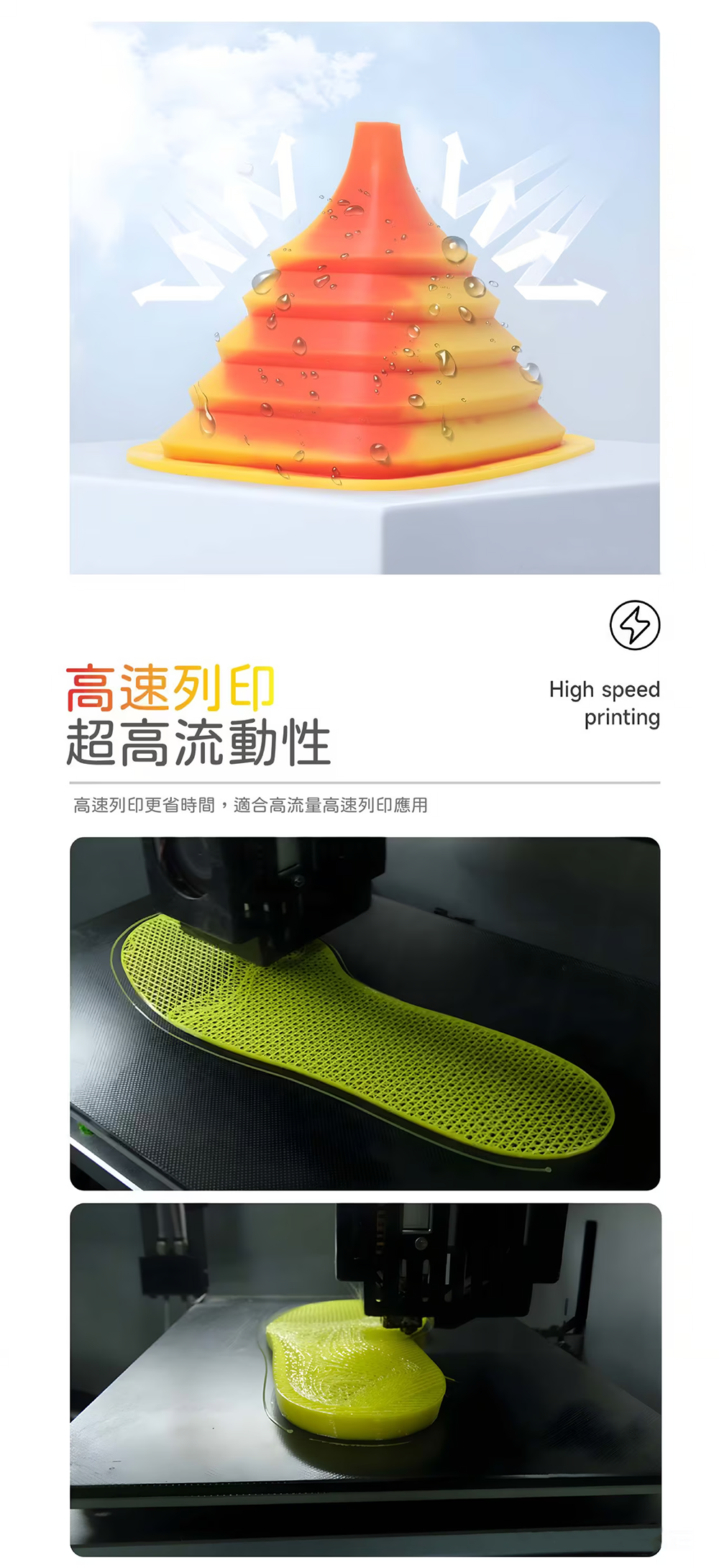 TPU溫變(TPU-Temp Color Change) 會在28℃低溫溫變,手捏變色;具有良好的柔韌性,硬度為95A,易於列印,可快速製作大型、複雜、精確的彈性體零件原型;較高的硬度與良好的回彈性,適合鞋墊等應用;超高流動性可高速列印,適配與近程列印,適配遠程的列印性能,適配遠端列印