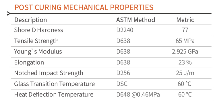 After forming, this material must undergo thorough post-curing process to achieve the best mechanical properties and durability.