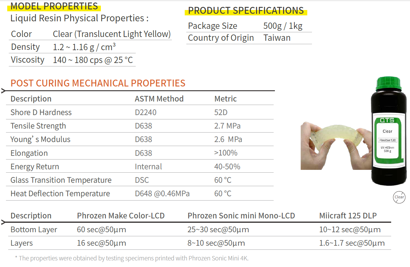 Unique memory-foam properties! QTS Flex 52D Slow-Rebound Resin, made in Taiwan, offers Shore 52D hardness with high toughness. Prints absorb impact and recover slowly, a revolutionary choice for damping pads and functional prototypes.