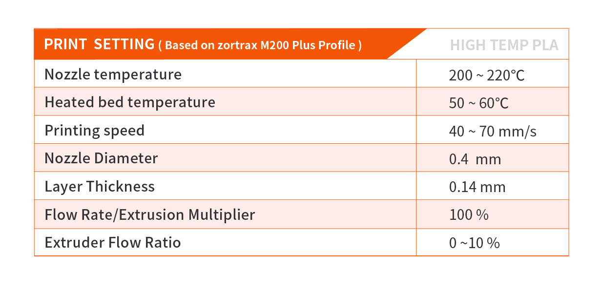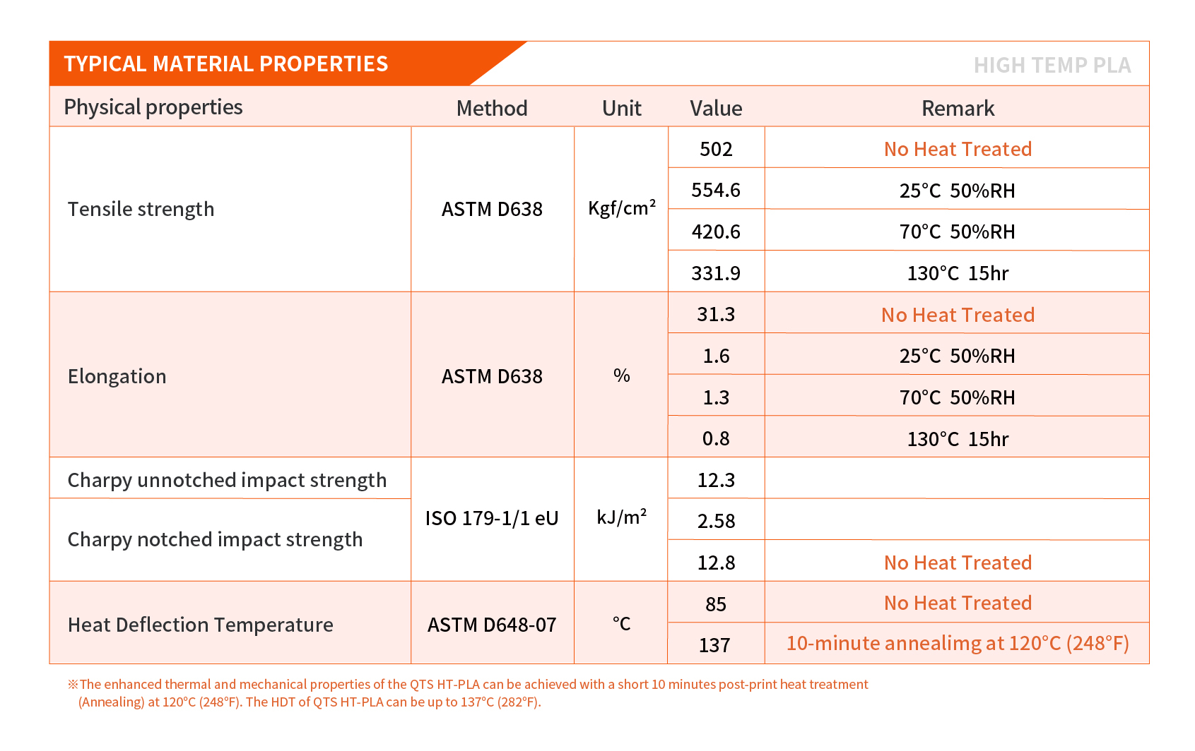 QTS High Temp PLA has the same printing parameters and features as standard PLA. Additionally, it can achieve higher temperature resistance after heat treatment, with a heat deflection temperature (HDT) reaching up to 137°C (282°F). The heat deflection temperature of standard PLA is 55°C, while that of ABS is 100°C. This means that High Temp PLA is easier to print, less prone to warp, and offers better temperature resistance comparing to ABS.