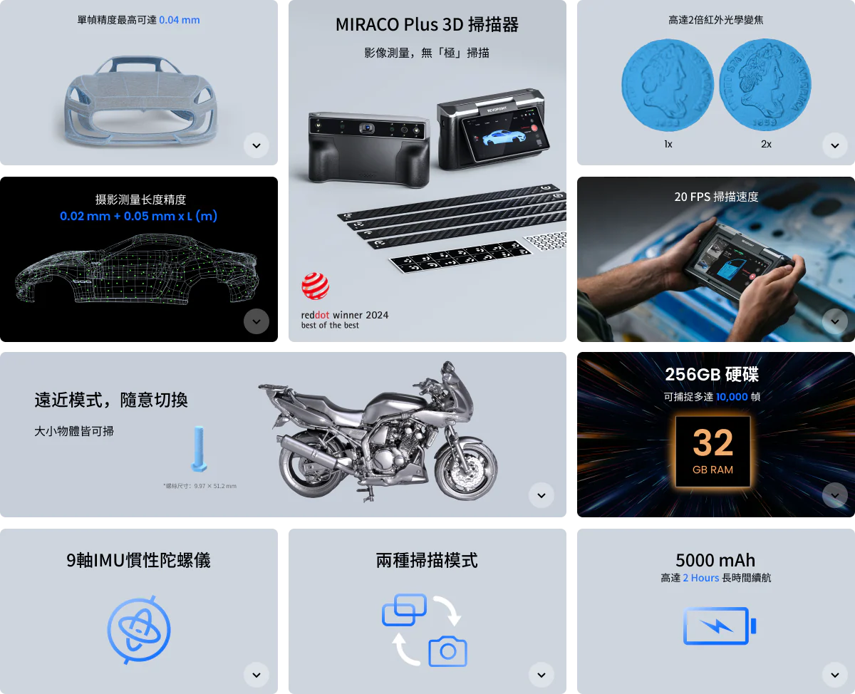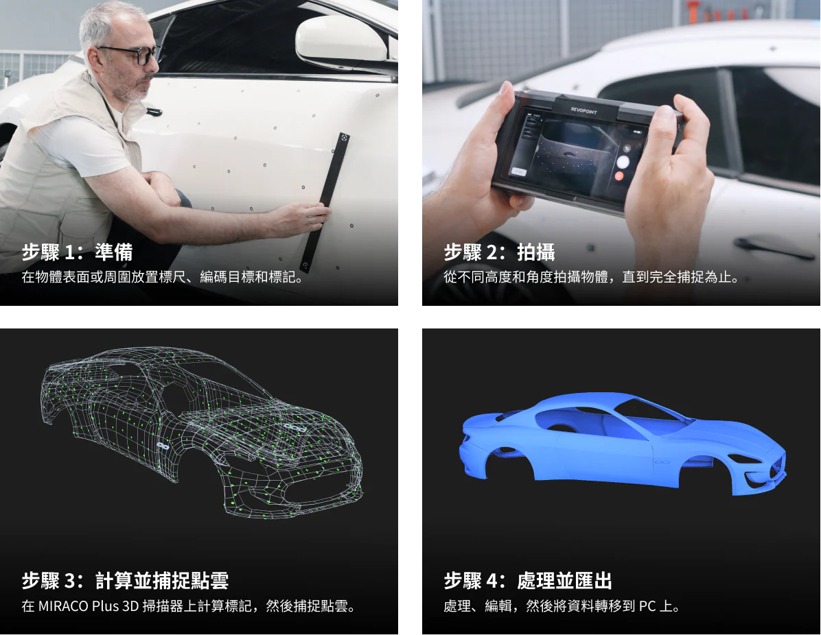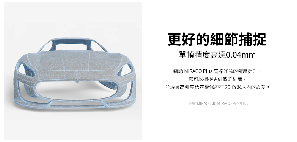 MIRACO Plus透過高精準度的全域性攝影測量套件,可以實現對汽車、船舶、飛機及機械部件等大型物體的計量級精確捕捉。