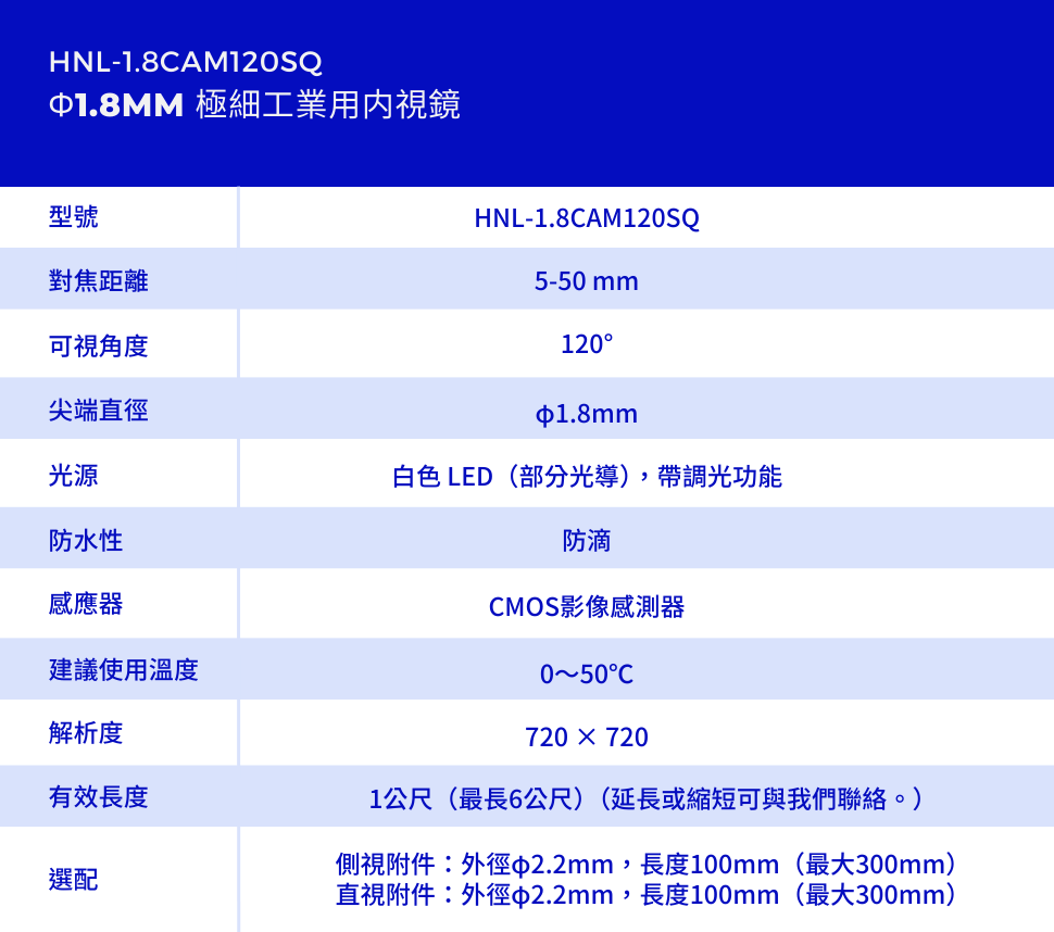 超薄工業內視鏡(直徑 1.8 mm)-高解析度型號隆重推出!這是上一代型號 HNL-1.8CAM120 的升級版。