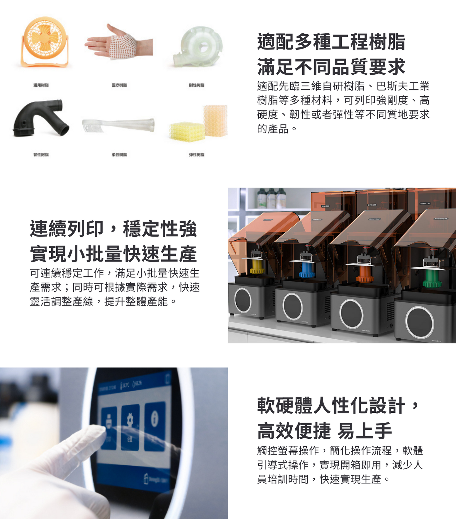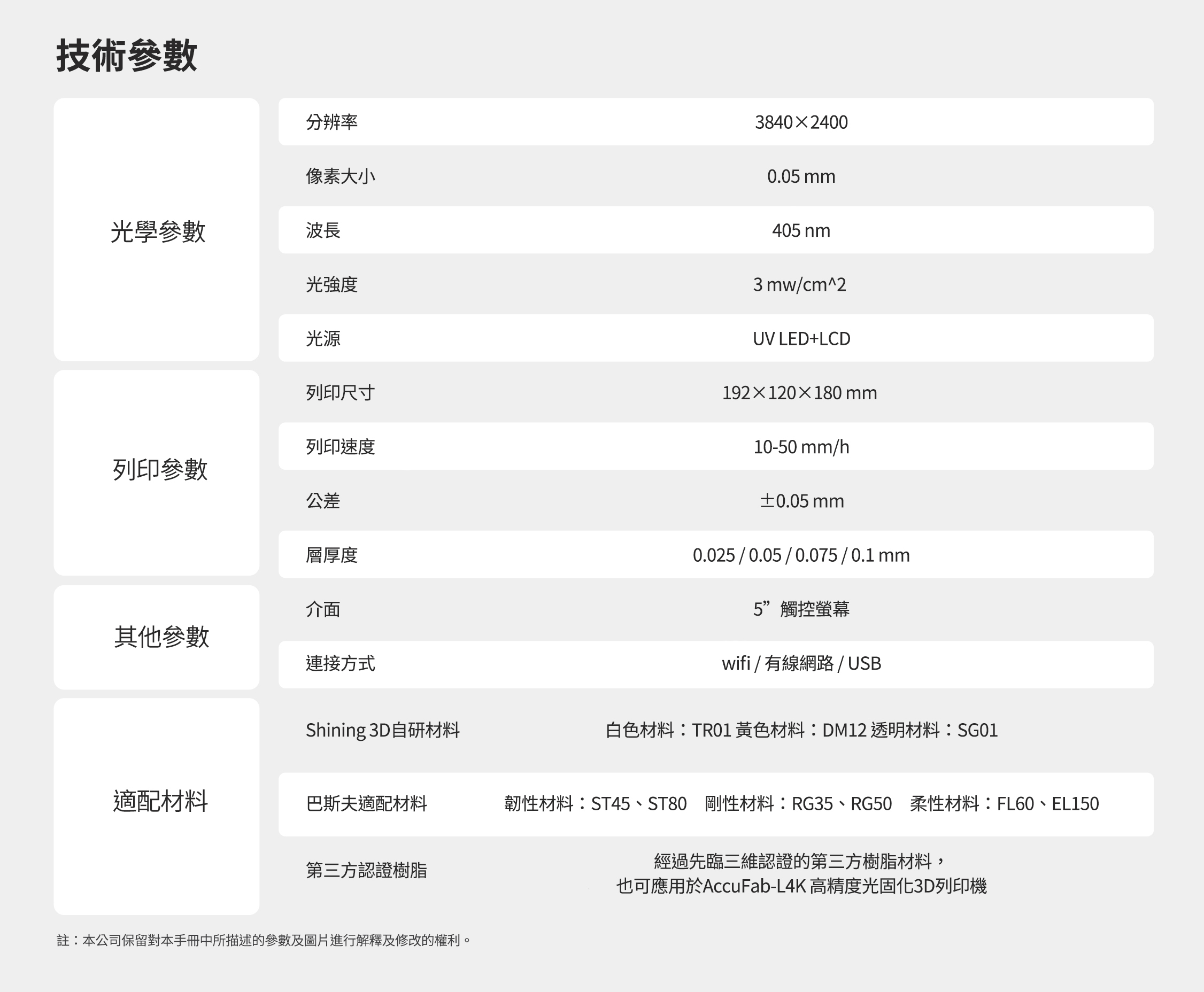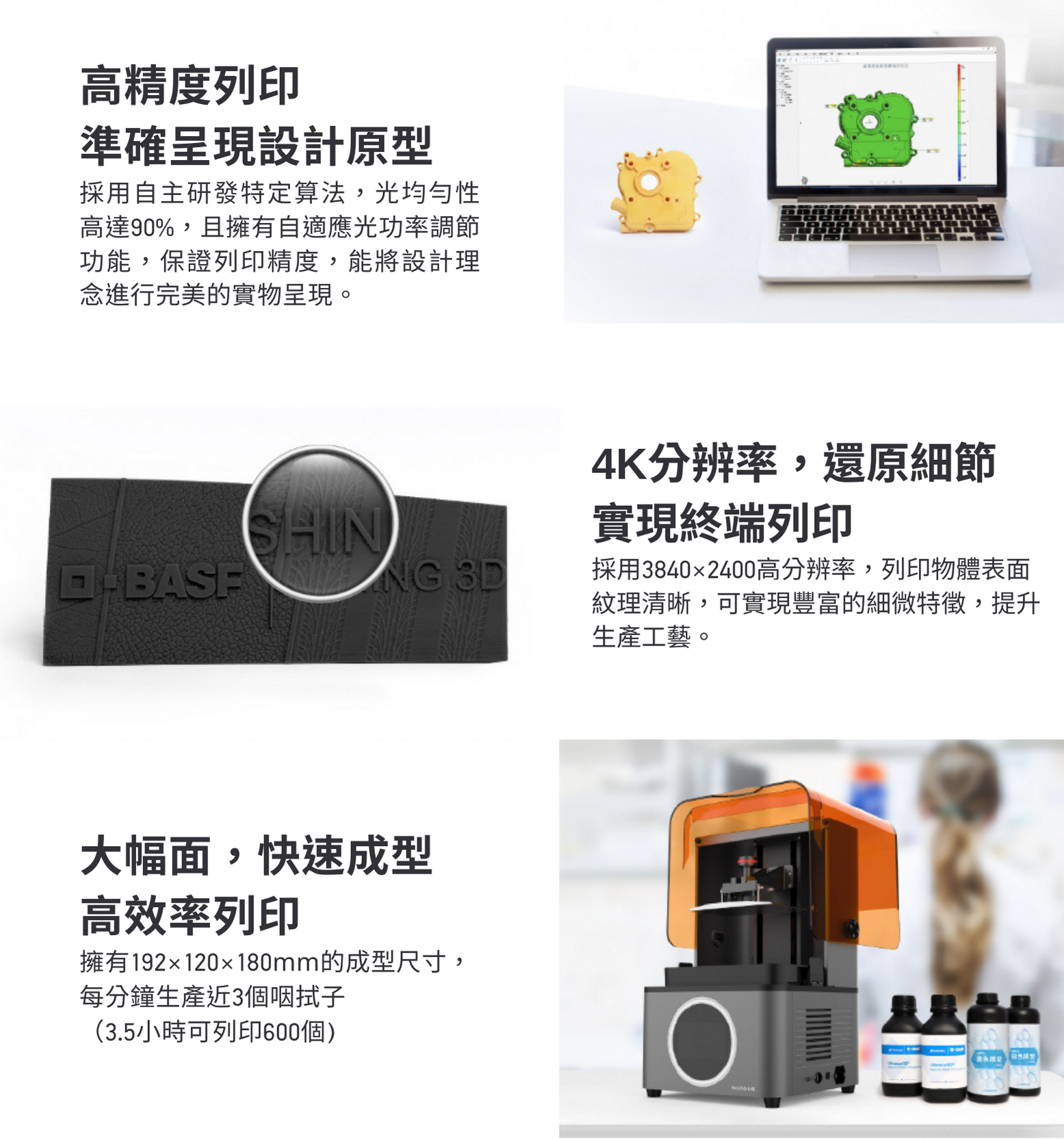 AccuFab-L4K高精度光固化3D 列印機是Shining 3D自主研發的高品質3D列印機,擁有4K高分辨率、192×120×180mm的成型尺寸,具備穩定、準確的列印精度,並支持連續穩定列印,能夠實現設計原型的快速迭代以及小批量快速生產,可應用於工業設計、零配件/手辦/醫療輔具列印等眾多專業領域。