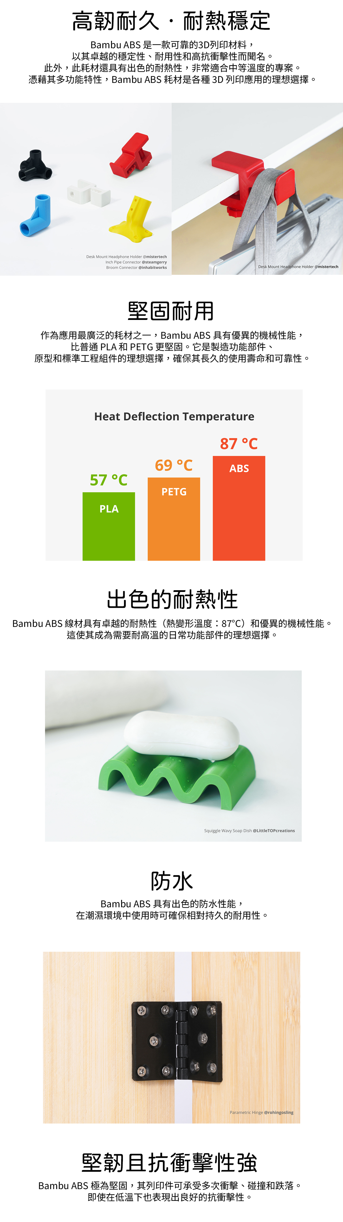 Bambu Lab ABS 具備優異的穩定性、機械強度與抗衝擊性,適合各類功能性與工程零件列印,熱變形溫度高達 87 °C,耐熱性能出色,並具備良好的防水能力,不論中溫或潮濕環境,都能維持穩定列印與長效耐用表現。