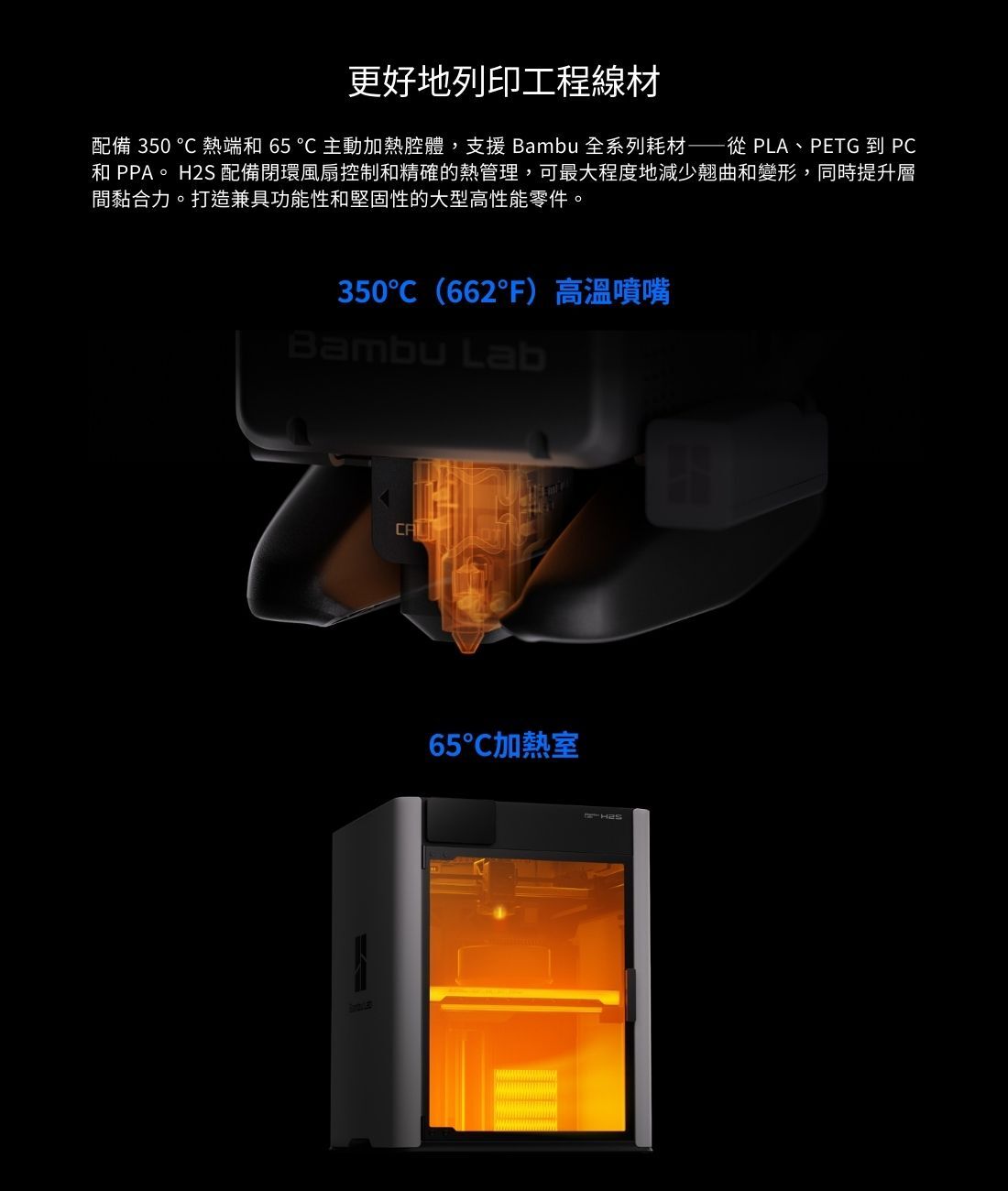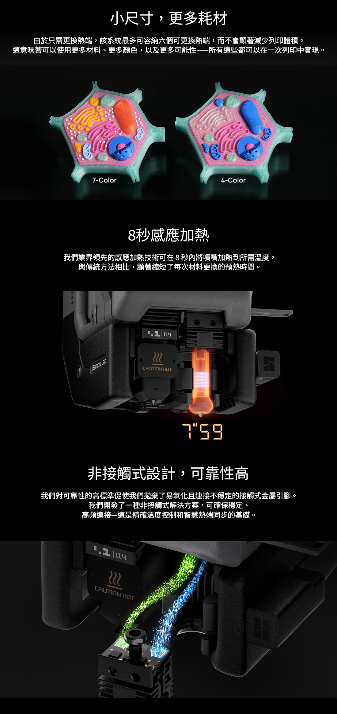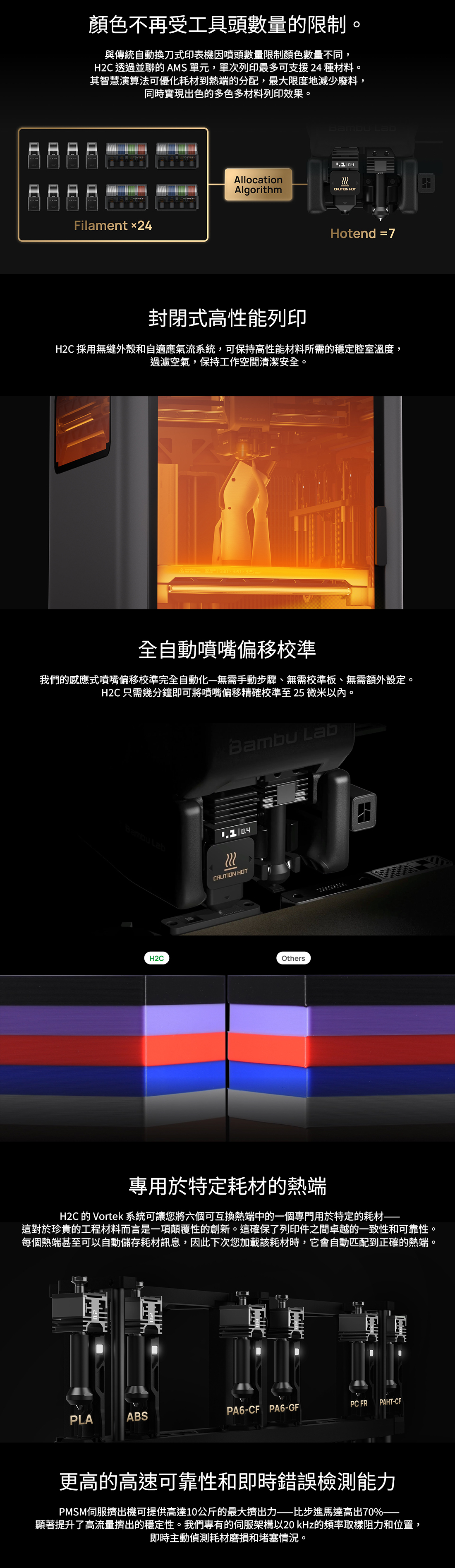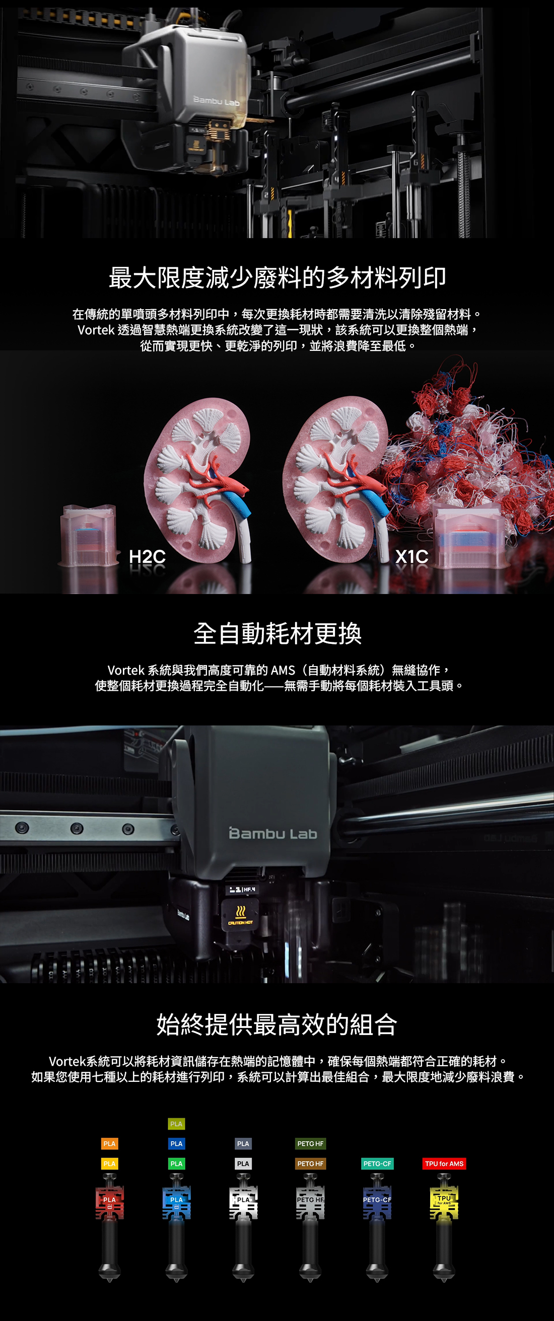 Bambu Lab H2C 採用全新 Vortek 無線熱端切換系統,為多材料與多色列印帶來突破性的效率提升。透過感應式高速加熱、零吐料換色流程、閉環伺服擠出以及 AI 全料徑偵測,有效降低材料浪費並強化列印穩定度。搭配 350°C 高溫噴嘴、65°C 主動恆溫列印艙與可選配的 10W/40W 雷射雕刻切割模組,H2C 能夠應對複雜模型、工程材料與創作加工需求,為專業創作者提供更高效、更全面的列印體驗。