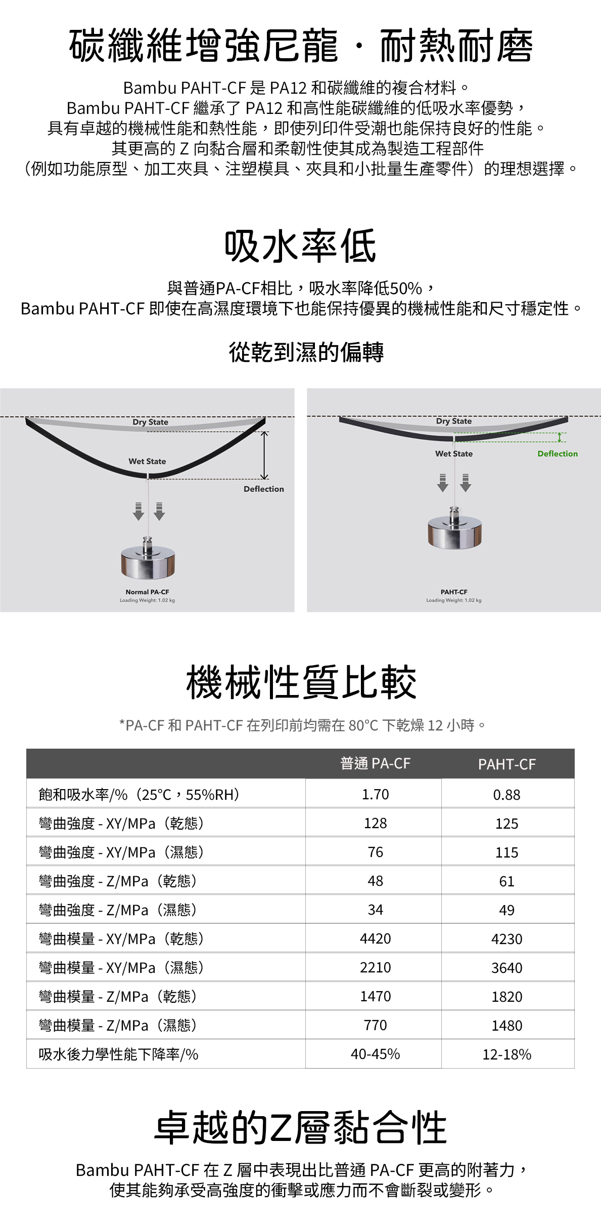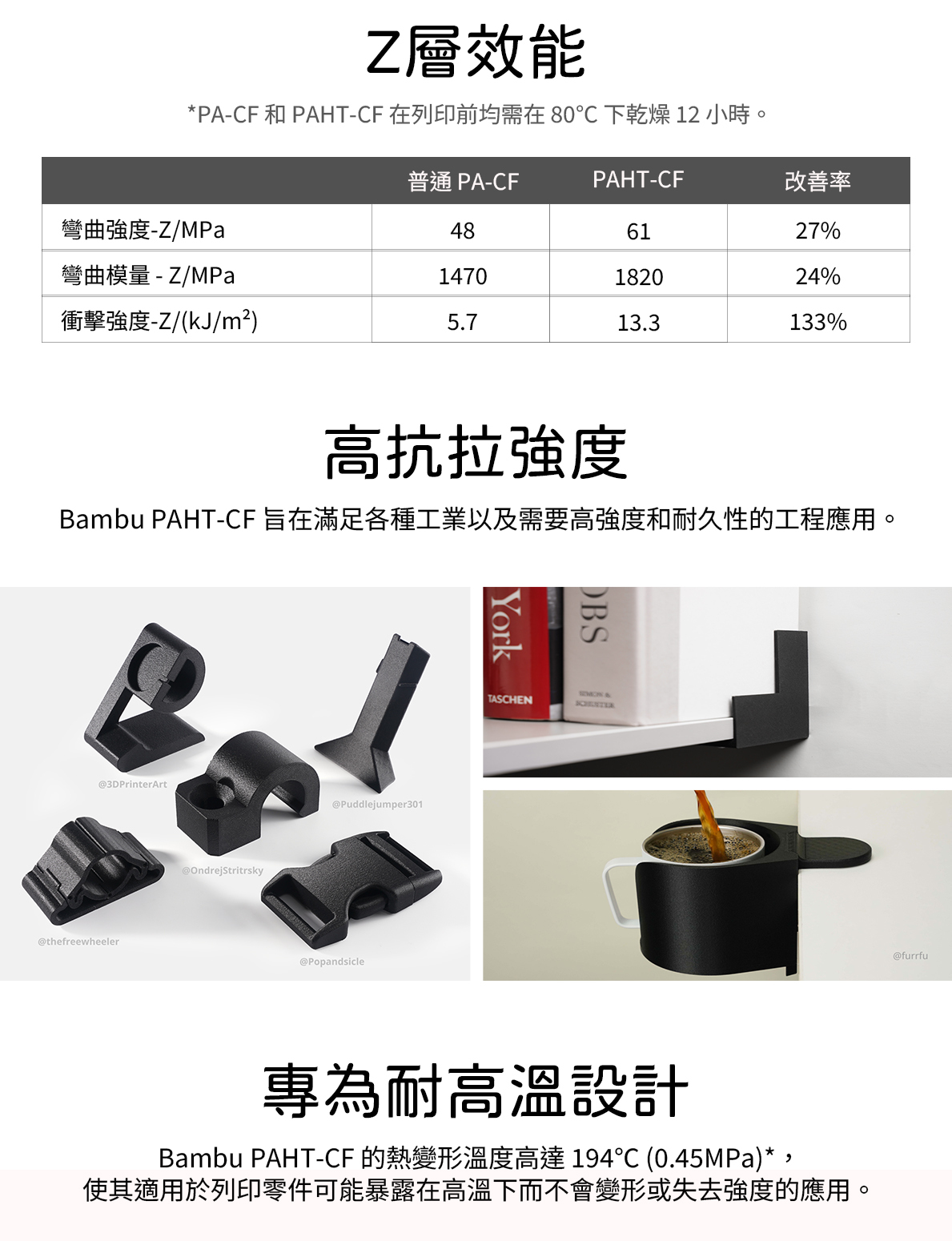 Bambu PAHT CF 是一款專為高強度與高耐熱應用設計的碳纖維增強尼龍線材,採用 PA12 與碳纖維複合配方,兼具優異的機械性能、尺寸穩定性與低吸濕性,特別適合用於功能性原型、夾治具、注塑模具與小批量生產零件等工程應用。