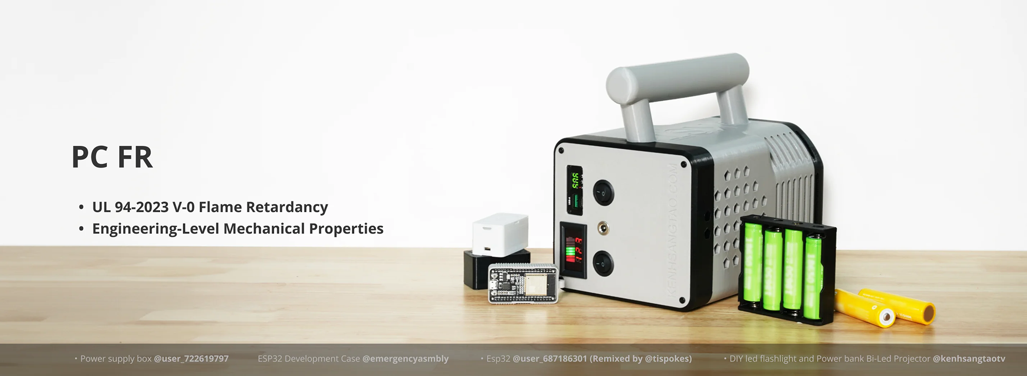 Bambu Lab PC FR為符合UL 94 V-0阻燃等級的工程級線材,具備優異的機械強度、耐衝擊性與耐熱性能,適用於高要求應用。支援AMS系統自動辨識參數,搭配高溫可重複使用線軸,操作便利又永續。建議使用前進行乾燥處理,以確保列印品質穩定。