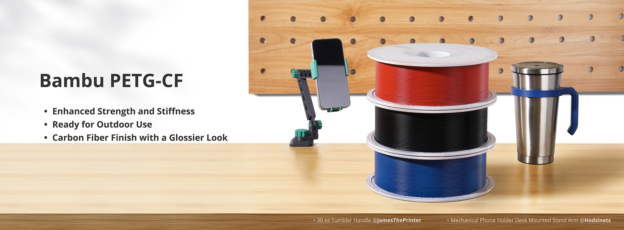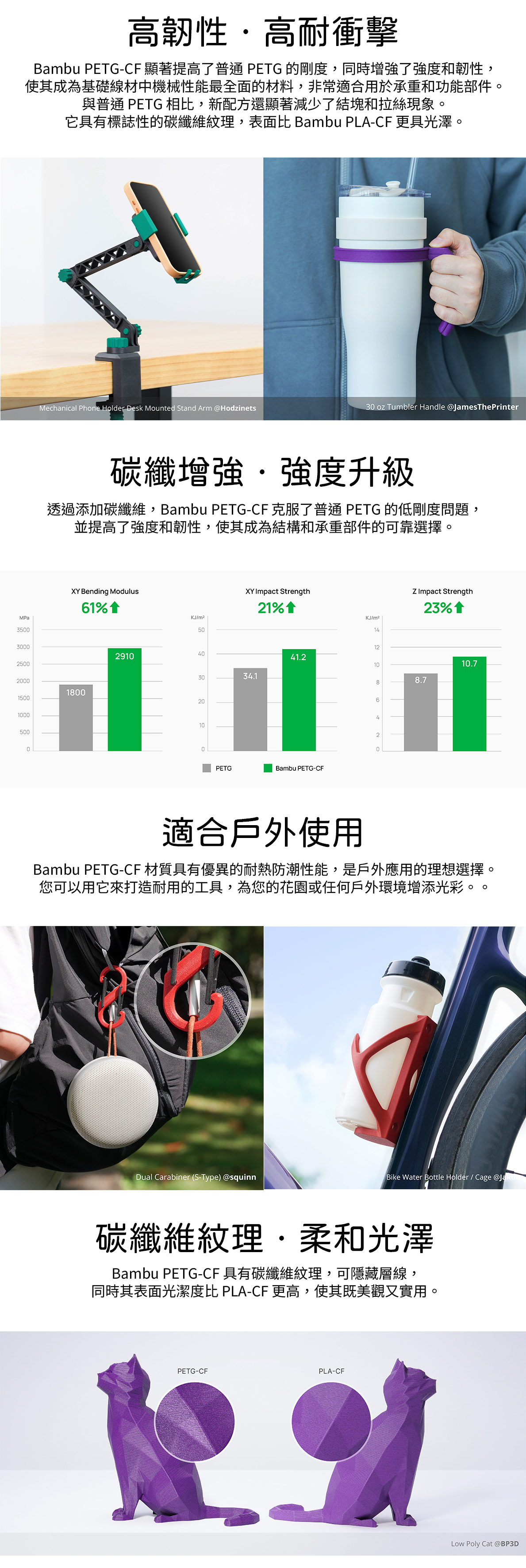 一款由 PETG 與碳纖維複合而成的 3D 列印線材,碳纖增強,強度升級。具備出色的剛性與韌性,列印成品表面呈現細膩的碳纖維紋理與柔和光澤,兼具高強度與美觀外觀,優異的剛性與耐衝擊性能,適合製作高強度功能件,例如無人機零件、賽車模型等需承受衝擊的功能性部件。列印穩定,不易拉絲,改良配方,有效減少 PETG 常見問題,表面質感獨特,帶有柔霧碳纖維紋理,機械感十足。