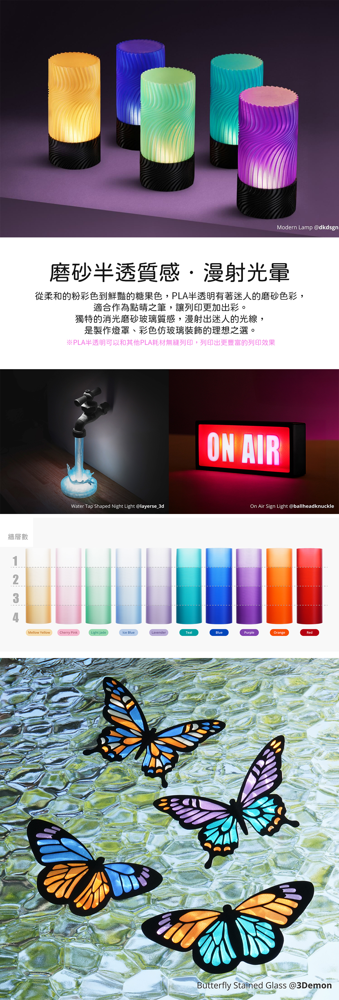 從柔和的粉紅顏色到鮮豔的糖果色,Bambu PLA 半透明材料提供一系列令人驚豔的磨砂色調,為您的印刷作品增添低調優雅與大膽活力。其獨特的霧面效果模仿手工吹製磨砂玻璃的質感,是製作燈罩、花瓶和彩色玻璃裝飾的理想之選。 PLA 半透明材質可與任何 PLA 耗材無縫黏合,讓您輕鬆為列印作品添加半透明效果,就像在列印過程中更換顏色一樣輕鬆。