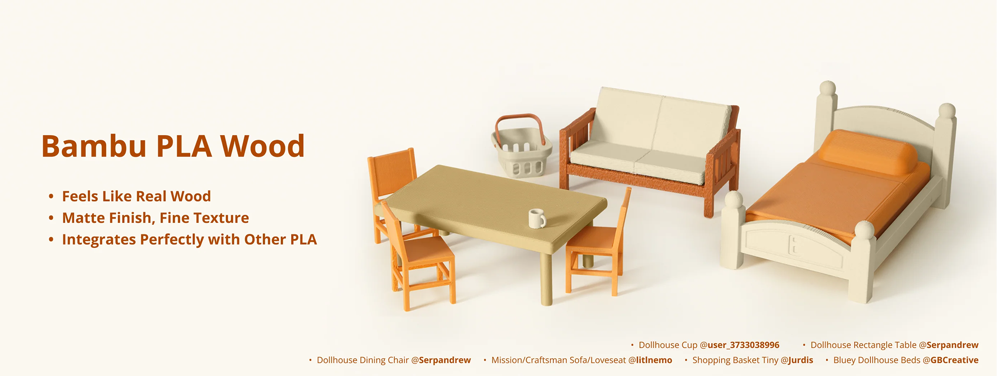 Bambu Lab Wood 仿木質外觀與觸感,添加天然木粉,列印成品具備真實木頭質感與自然紋理,易加工、可上色,可進行打磨、上漆與雕刻,適合工藝品、模型與裝飾應用,列印穩定、無翹曲,優化配方,確保列印過程穩定,適合初學者與進階用戶,環保友善,使用可再生材料,無刺激性氣味。