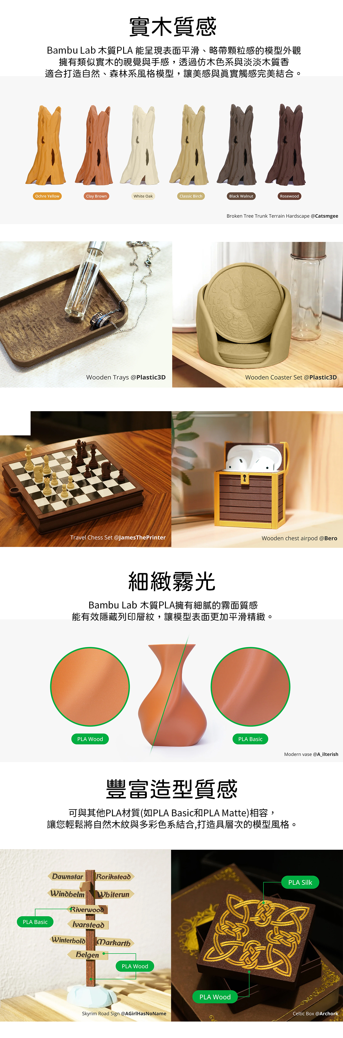 仿木質外觀與觸感,添加天然木粉,列印成品具備真實木頭質感與自然紋理,易加工、可上色,可進行打磨、上漆與雕刻,適合工藝品、模型與裝飾應用,列印穩定、無翹曲,優化配方,確保列印過程穩定,適合初學者與進階用戶,環保友善,使用可再生材料,無刺激性氣味。