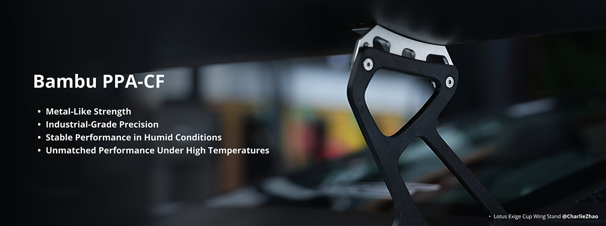Bambu PPA CF 特色在於以碳纖維強化聚芳香族聚醯胺,兼具高強度、高剛性與耐熱特性(熱變形溫度達227℃),可穩定輸出精密且堅固的工程級零件,適合長期承受結構應力的應用場景,是專業用戶打造功能性與高耐用性列印件的理想選擇。