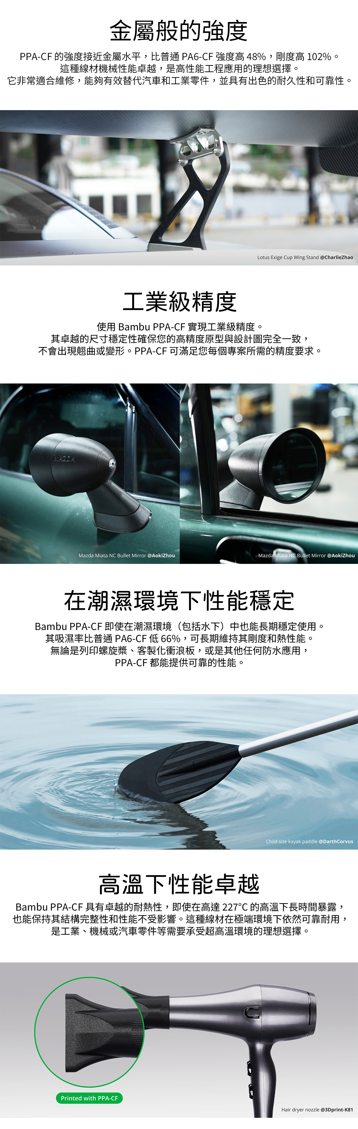 ⚠️注意:Bambu PPA CF 為高性能工程級碳纖線材,具備高強度、高剛性與耐熱特性(熱變形溫度約227℃),適合應用於承力結構件、汽車零件與治具,但因脆性較高,不建議用於需長期受衝擊或高韌性的零件;列印時需高溫環境(噴嘴280–310℃、熱床100–120℃),並建議使用硬化鋼噴嘴與PEI平台搭配膠水以降低翹曲,且材料吸濕性高,使用前務必進行烘料並於密封環境保存,列印風扇則建議低速或關閉以確保層間附著力。