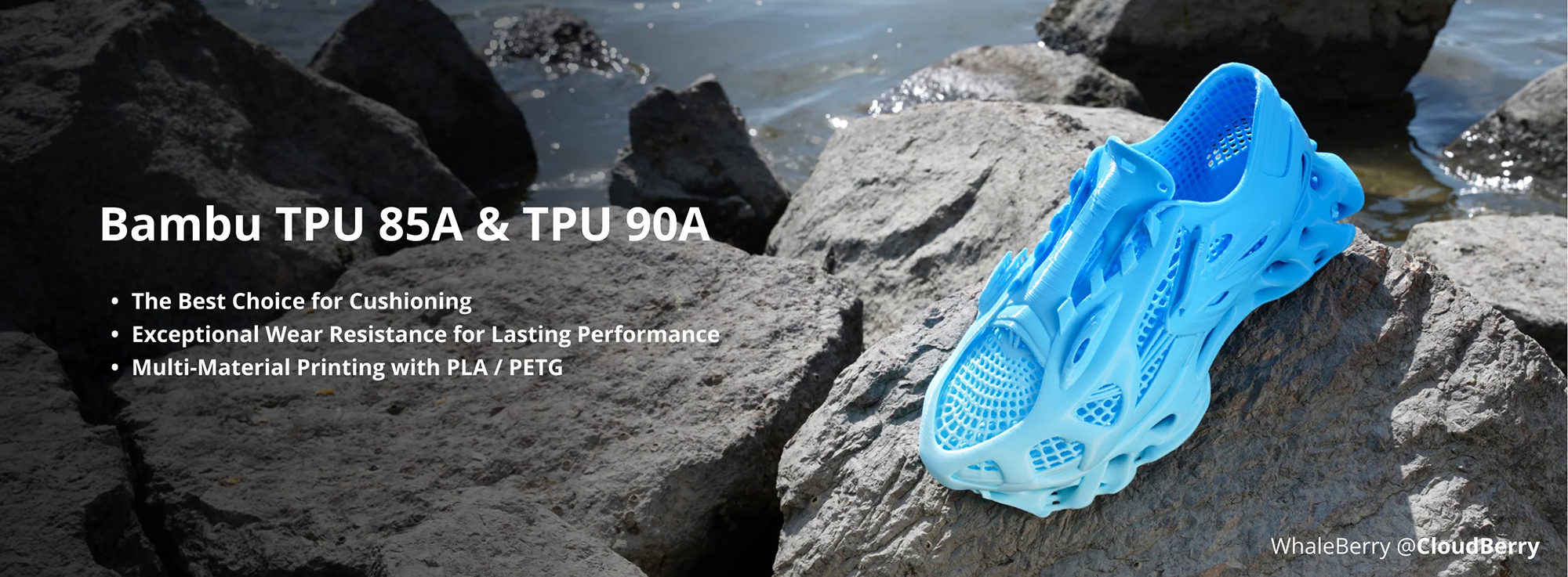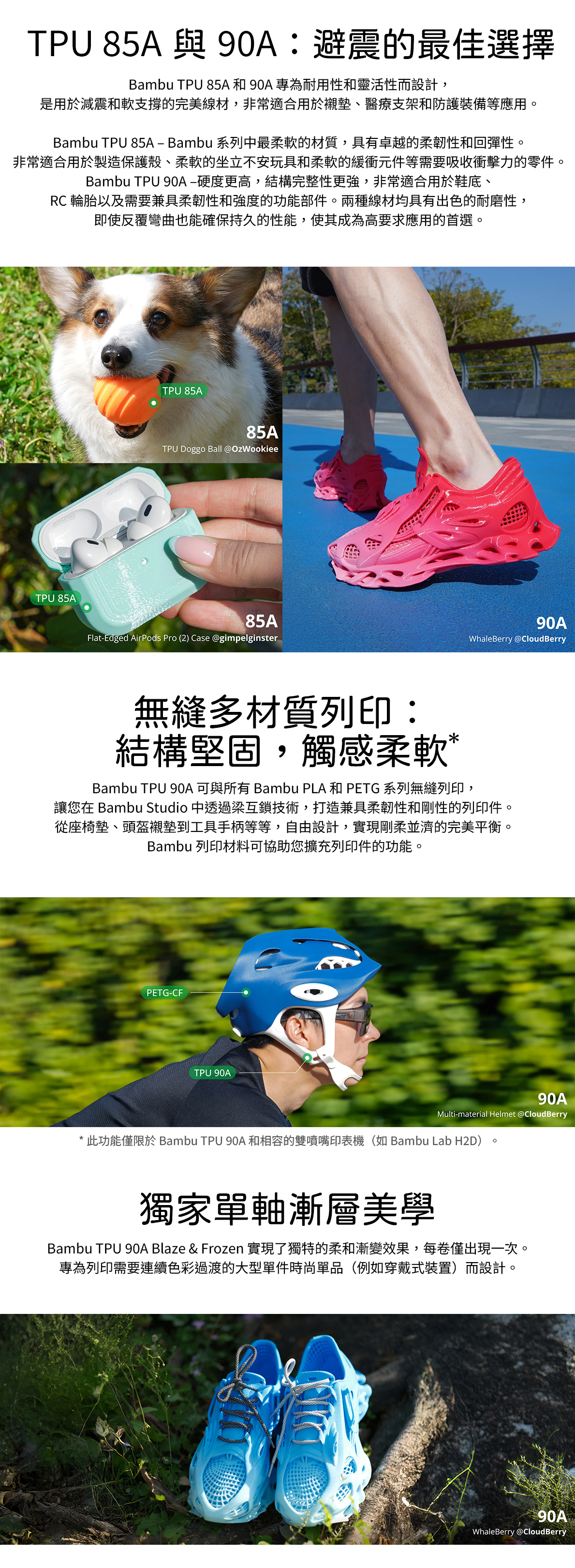 Bambu TPU 85A 與 TPU 90A 是 Bambu Lab 最柔軟的彈性線材,具備卓越的柔韌性與回彈力,適合列印需要緩衝吸震效果的部件,如握把、避震器與防護殼等;其中 TPU 90A 可與 PLA 與 PETG 線材完美搭配,透過雙噴頭機種H2D實現剛性與彈性材料的高效結合,讓功能性混合列印成為可能,是實現創意與實用兼具模型的理想選擇。