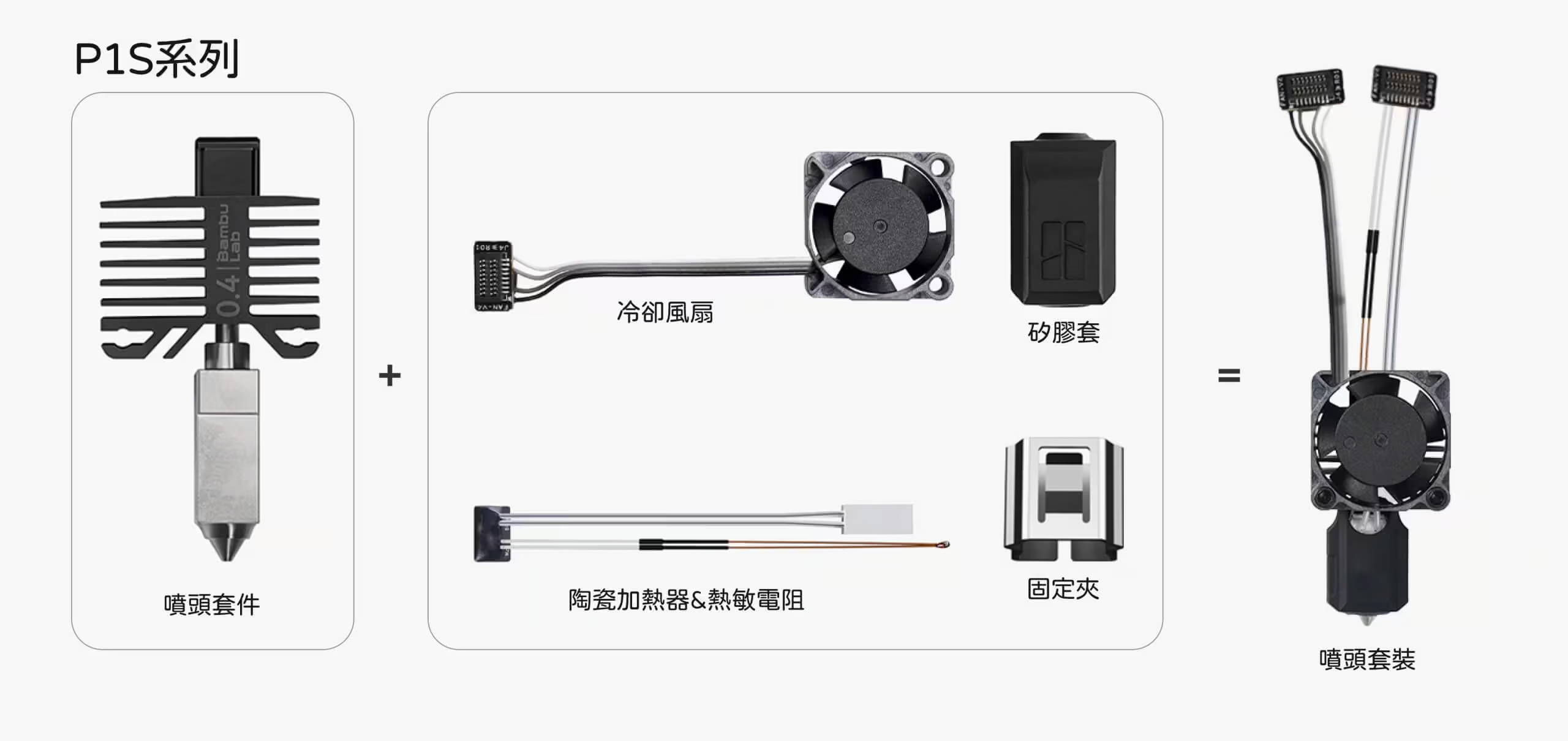 硬化鋼噴頭套裝內含有硬化鋼噴嘴、矽膠套、陶瓷加熱器、熱敏電阻和冷卻風扇,它具備超強的韌性和使用壽命,並且易於安裝、更換簡單。適用於普通 1.75mm 3D列印機耗材,也適用於尼龍碳纖維、尼龍玻璃纖維等工程耗材。