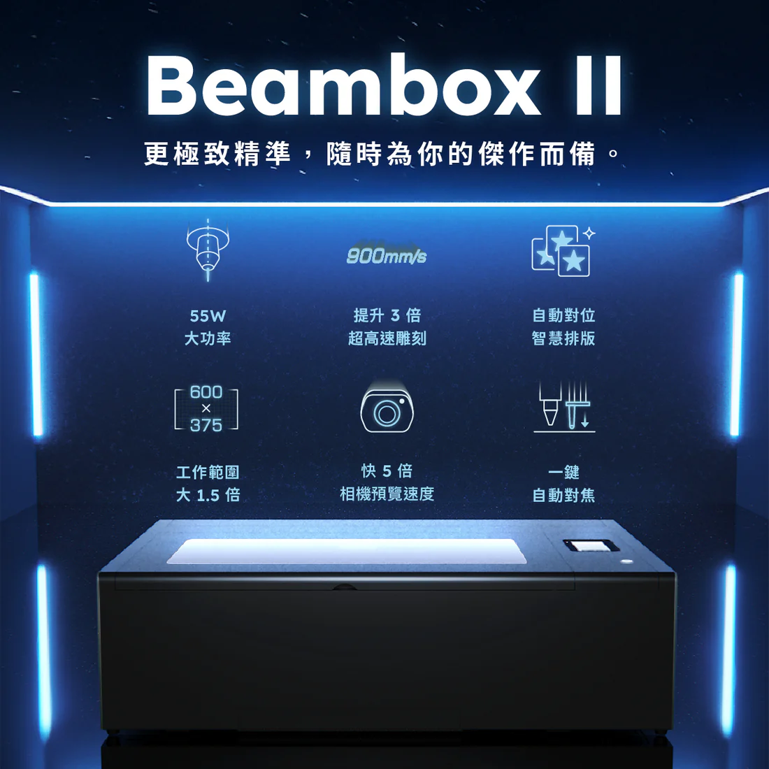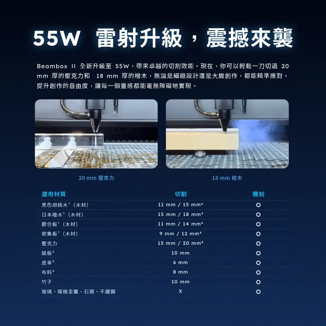 Beambox II 升級雷射瓦數至 55W CO2、雕刻速度來到 900mm/s、更深的工作高度 125mm、內建自動對焦、火焰偵測和緊急停止按鈕、內建紅光預覽。