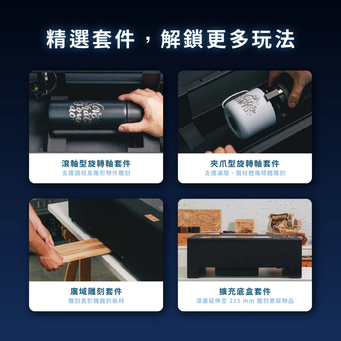 Beambox II 支援曲面雕刻、擴充底盒套件提供更厚的工作深度至 215mm,搭配旋轉軸套件即可輕鬆雕刻 40oz Stanley 杯,廣域雕刻套件幫助你加工無限長材質。
