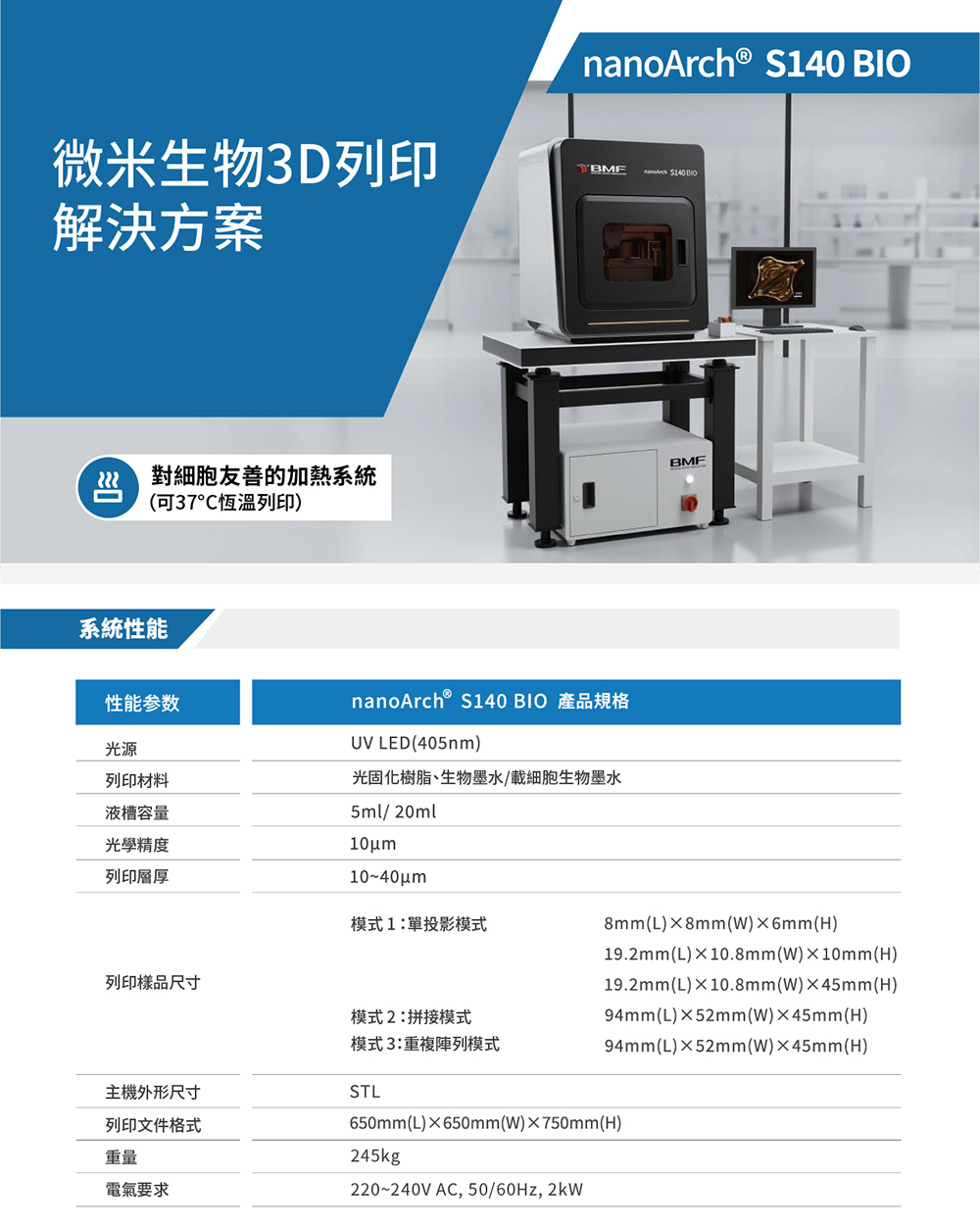 如果您正在尋找大幅面高精度微米級 3D 列印和新材料開發解決方案,BMF nanoArch S140 BIO 是您的最佳選擇。