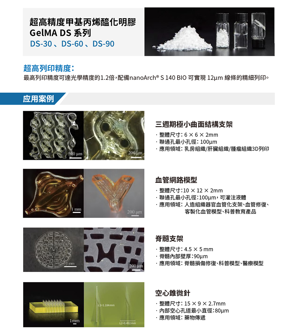 BMF nanoArch® S140 BIO,是一款微米級生物3D列印設備,配置小液槽(5ml/20ml),搭載加熱系統,支援生物墨水/載活細胞生物墨水列印,具有高分辨率,成型速度快,複雜精細結構一次成型的優勢。另配置高精度GelMA材料,兼俱生物相容性、可降解性、組織相似性、力學調控性及細胞親和力等特性,可用於建構複雜微觀生物組織結構。