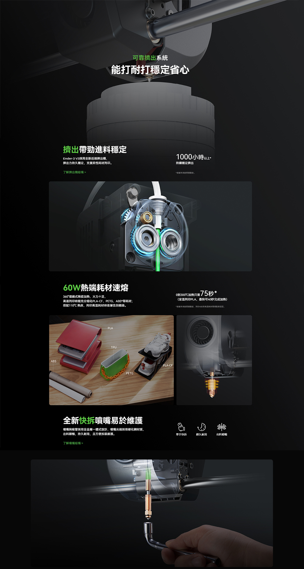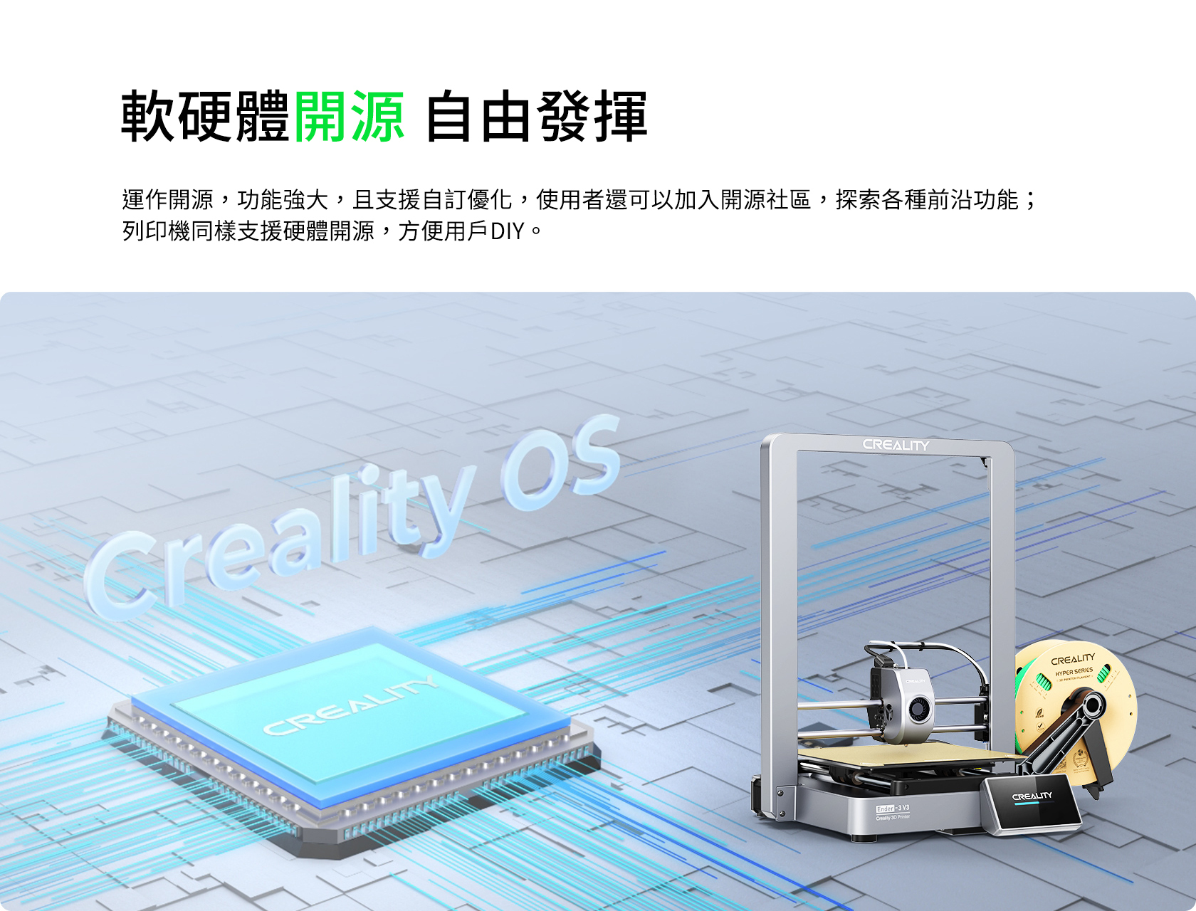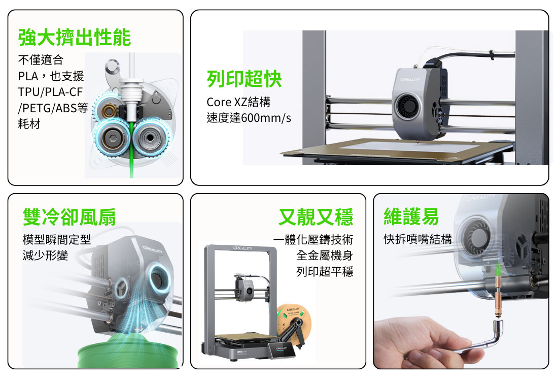 創新突破,引進Core XZ結構、全金屬機身、Creality OS、模型冷卻雙風扇,讓3D列印體驗煥然一新。列印速度達600mm/s,最高比傳統i3結構機器快12倍。機身採用鋁合金一體壓鑄技術,超平穩。新一代噴頭組件,可持續穩定出料1000小時以上,而且支援300℃高溫列印。基於Klipper打造的智慧化Creality OS,一鍵即可自動完成調平、振紋優化偵測等步驟,大幅降低使用門檻。