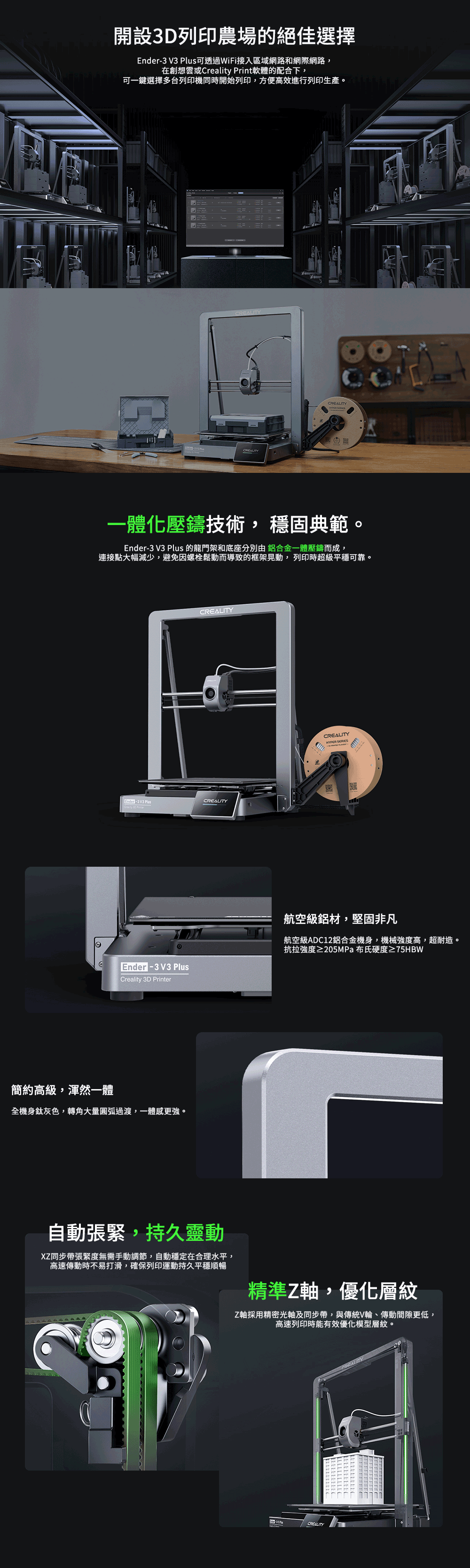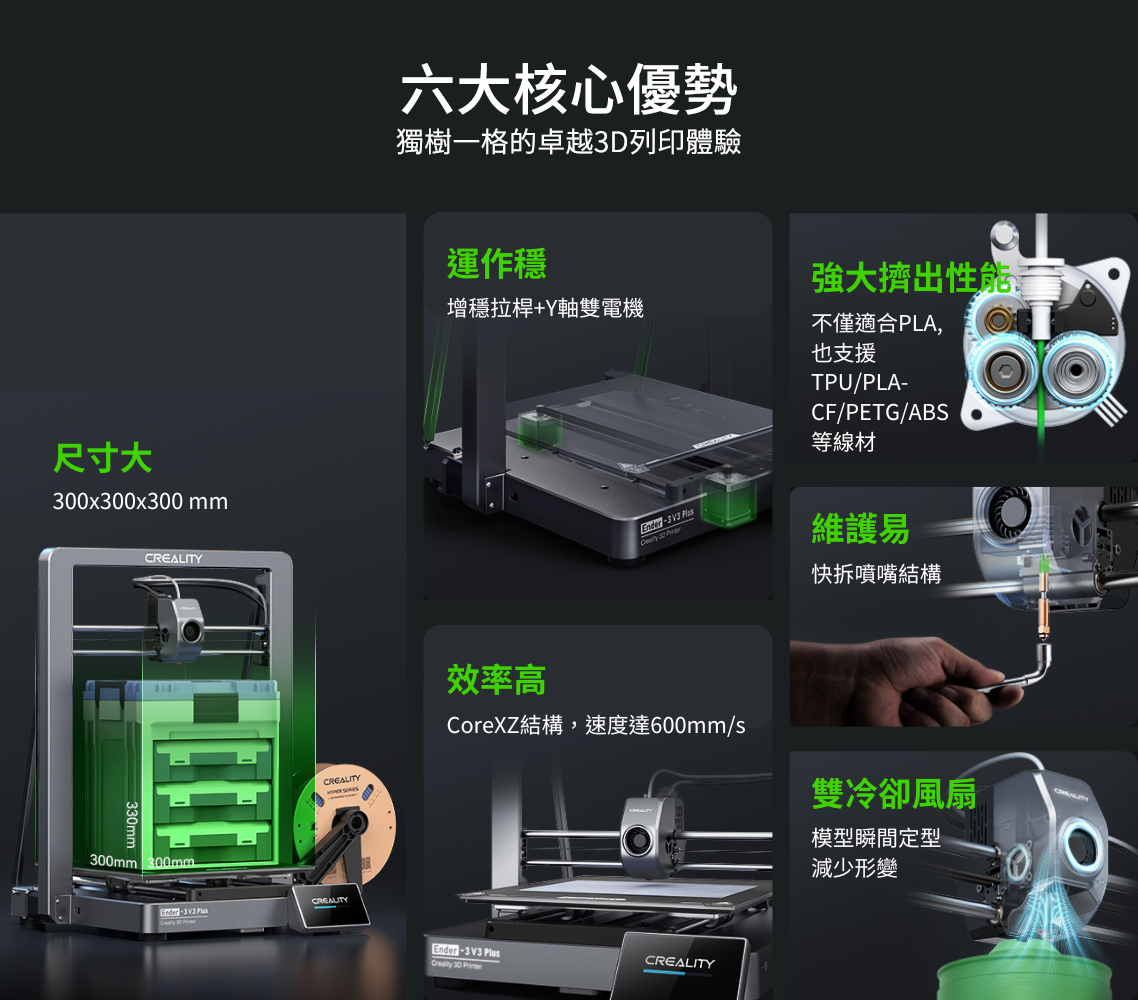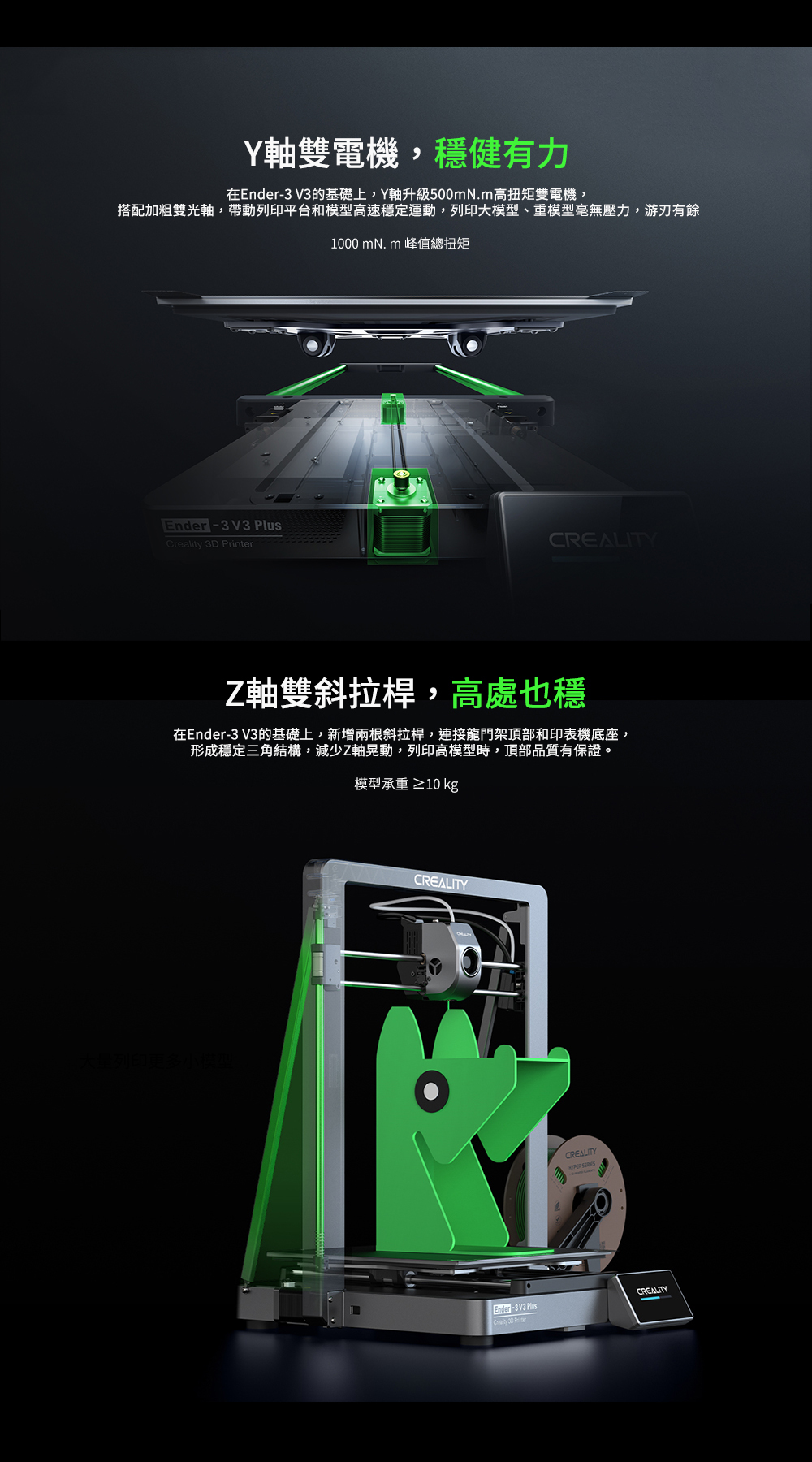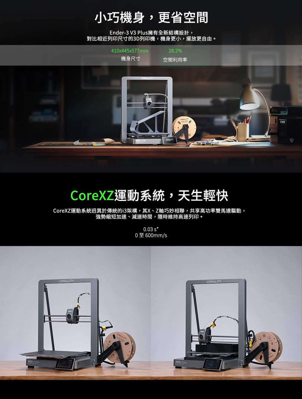 Ender-3 V3 Plus在成型尺寸上擴大至300*300*330mm,雙Y軸馬達和雙斜拉桿配置,有效提高列印穩定性和列印品質。 Ender-3 V3 Plus持續採用創新CoreXZ結構、一體壓鑄技術、智慧型Creality OS、全新近端擠出、快速噴嘴、模型冷卻雙風扇等功能,最高列印速度600mm/s, 加速度可達20000mm/s²。