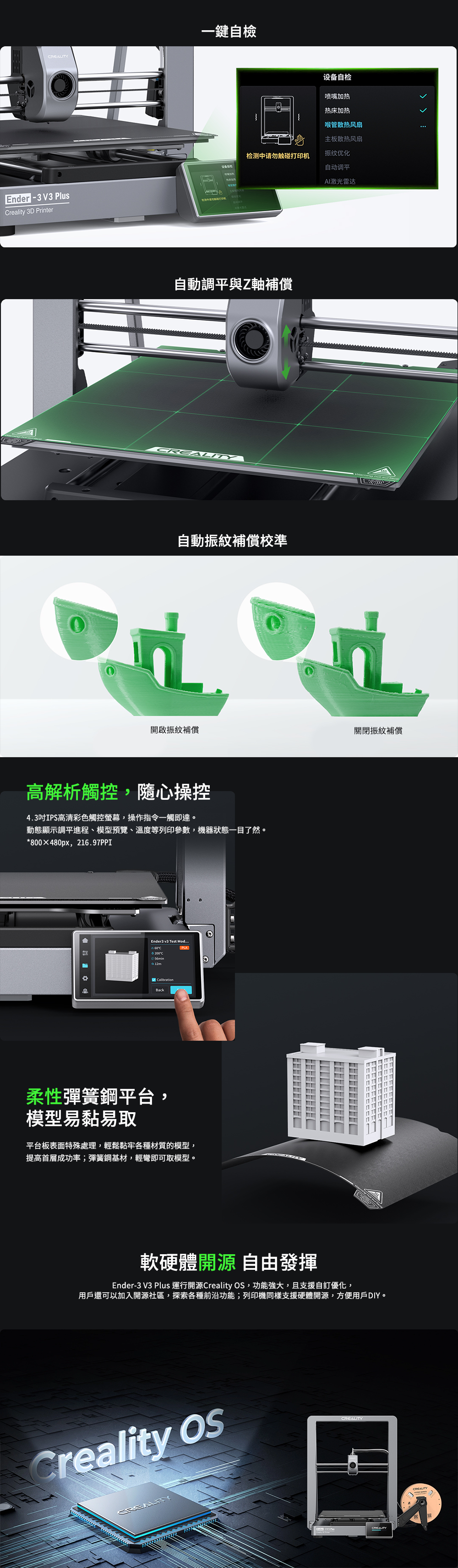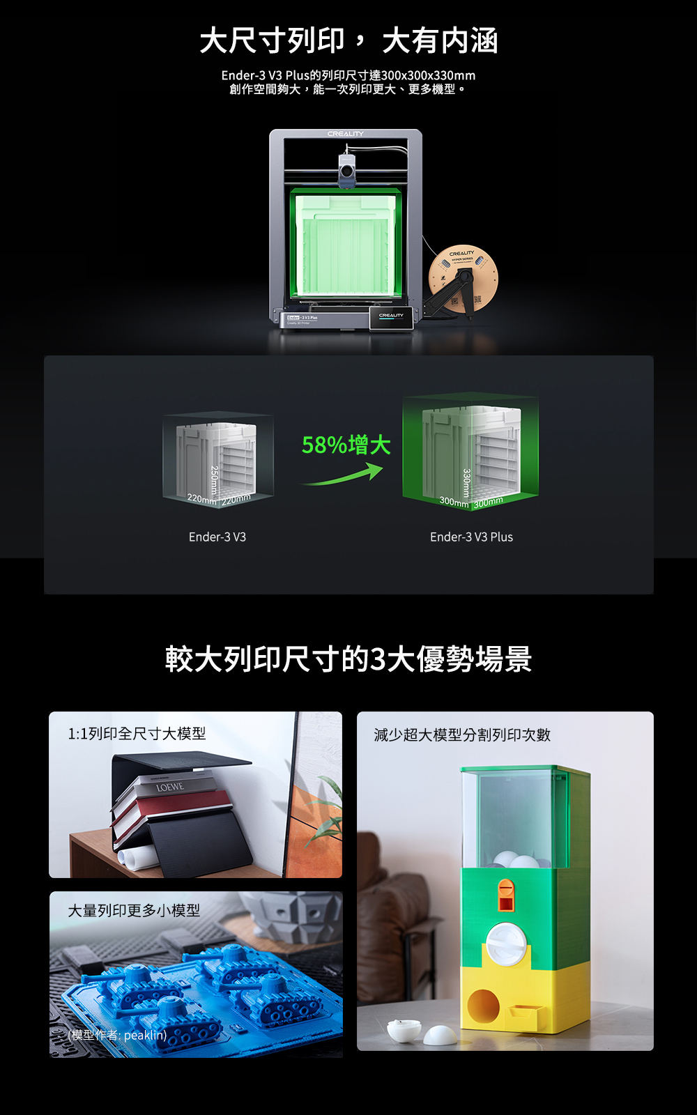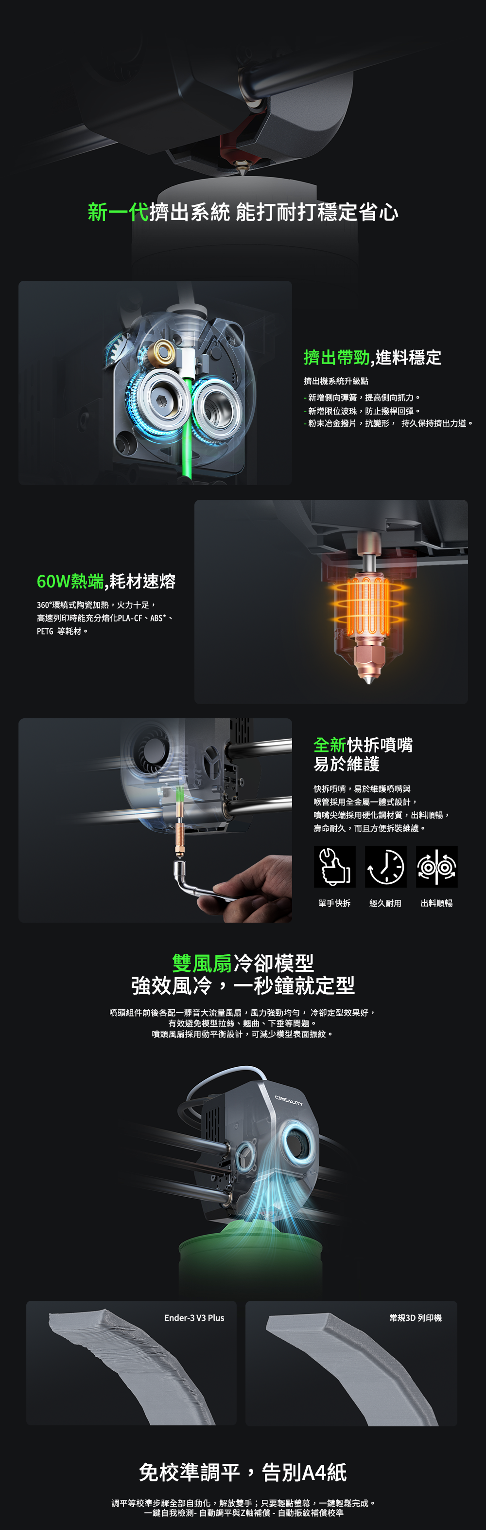 Ender-3 V3 Plus在成型尺寸上擴大至300*300*330mm,雙Y軸馬達和雙斜拉桿配置,有效提高列印穩定性和列印品質。 Ender-3 V3 Plus持續採用創新CoreXZ結構、一體壓鑄技術、智慧型Creality OS、全新近端擠出、快速噴嘴、模型冷卻雙風扇等功能,最高列印速度600mm/s, 加速度可達20000mm/s²。