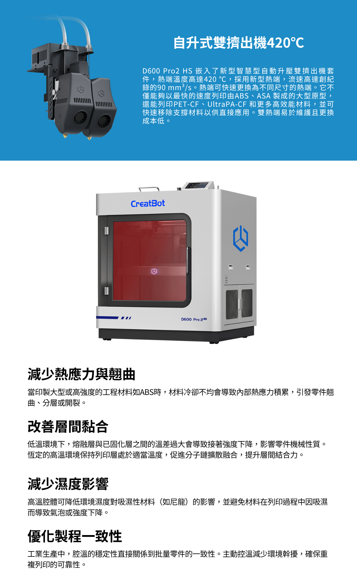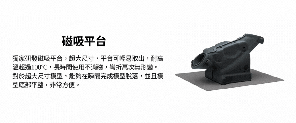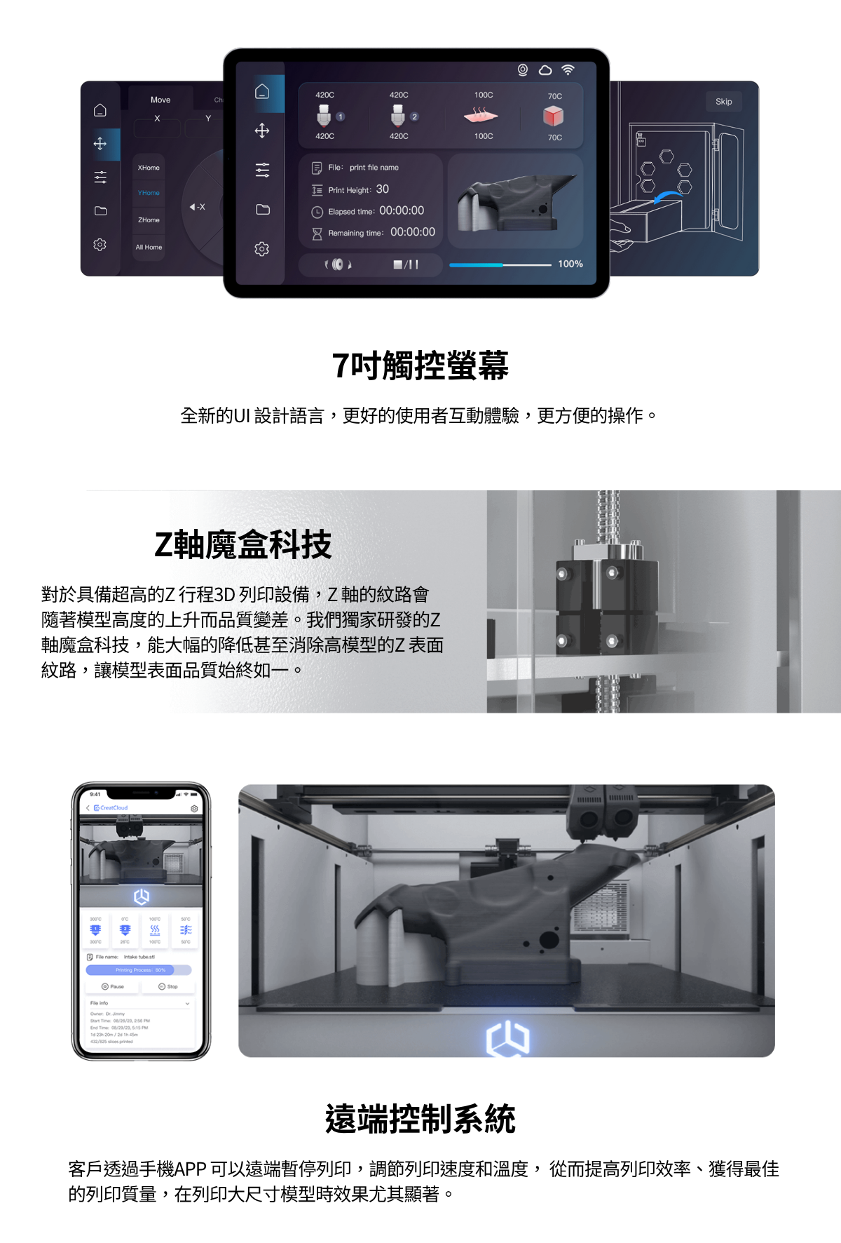 配備 420°C自動升降雙噴頭、磁吸平台 與 Z軸魔盒科技,確保高精度與穩定度。