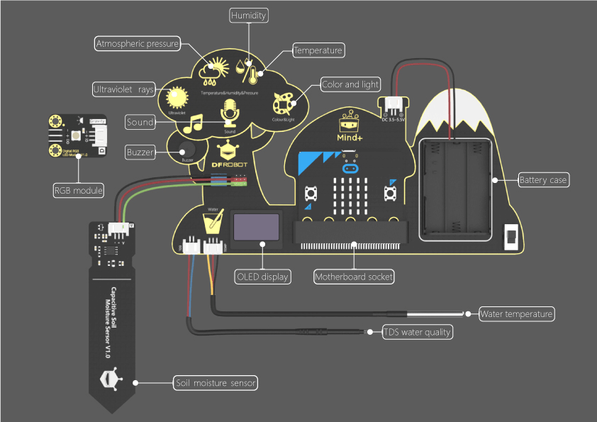 ◆ 集成10個傳感器(包括紫外線傳感器,溫度傳感器,濕度傳感器,氣壓傳感器,聲音傳感器,顏色傳感器,光傳感器,水溫傳感器,TDS水質傳感器,土壤濕度傳感器)