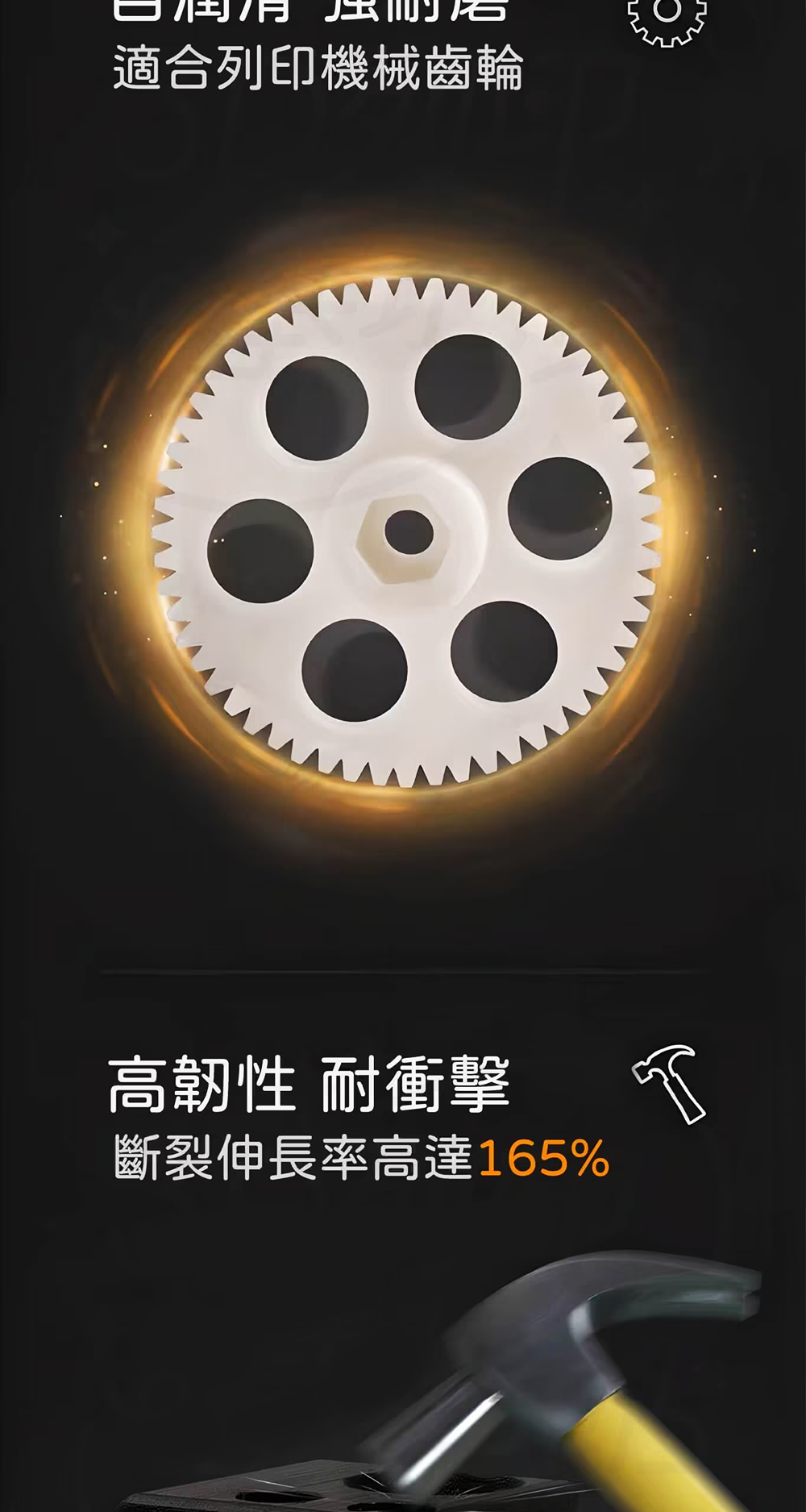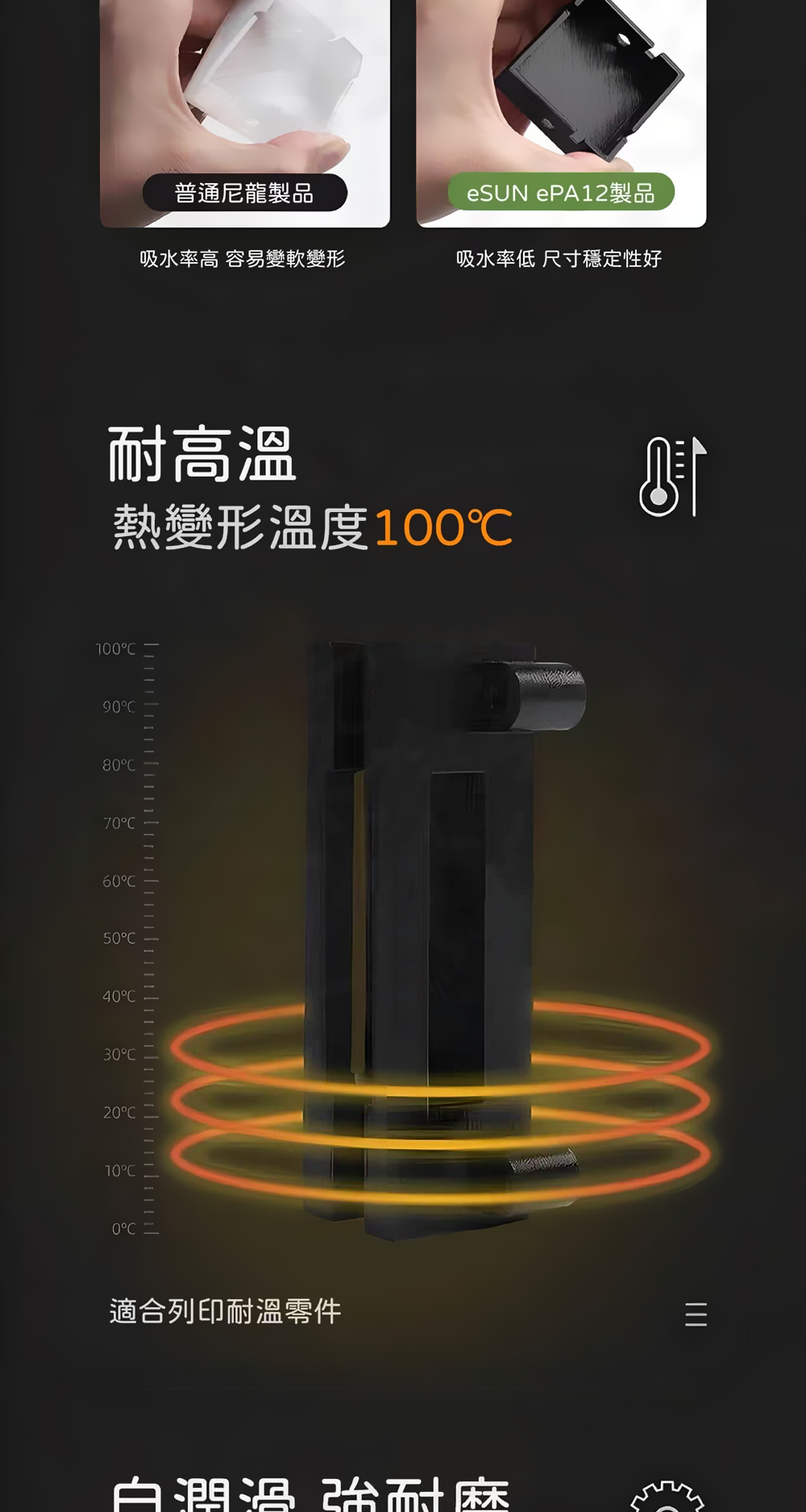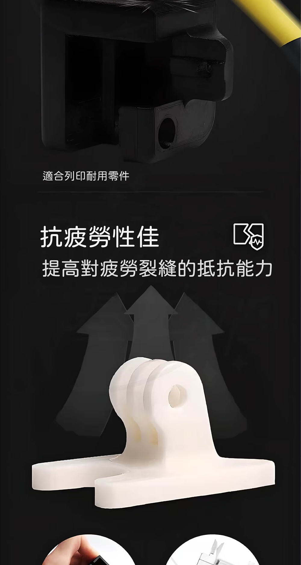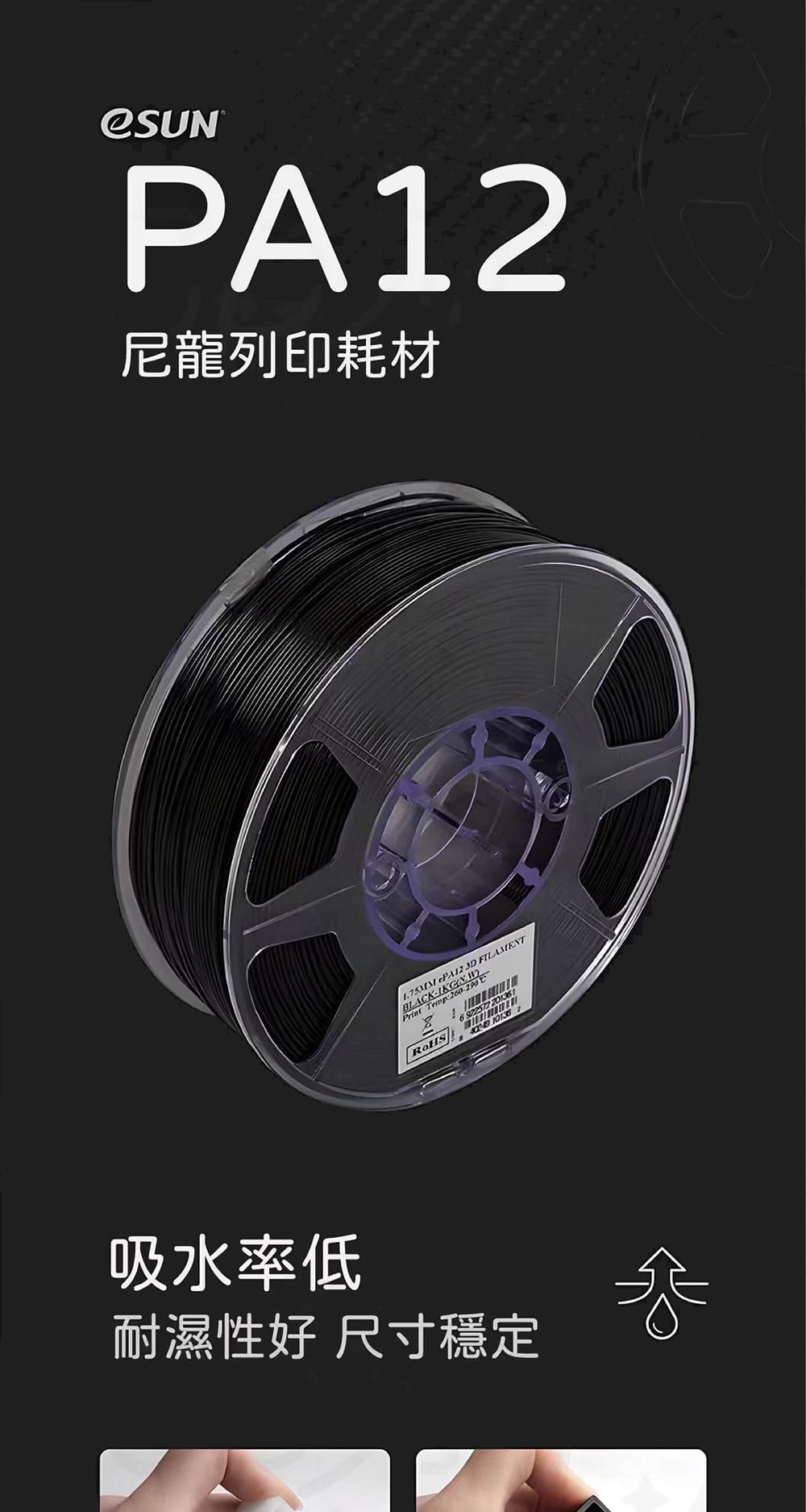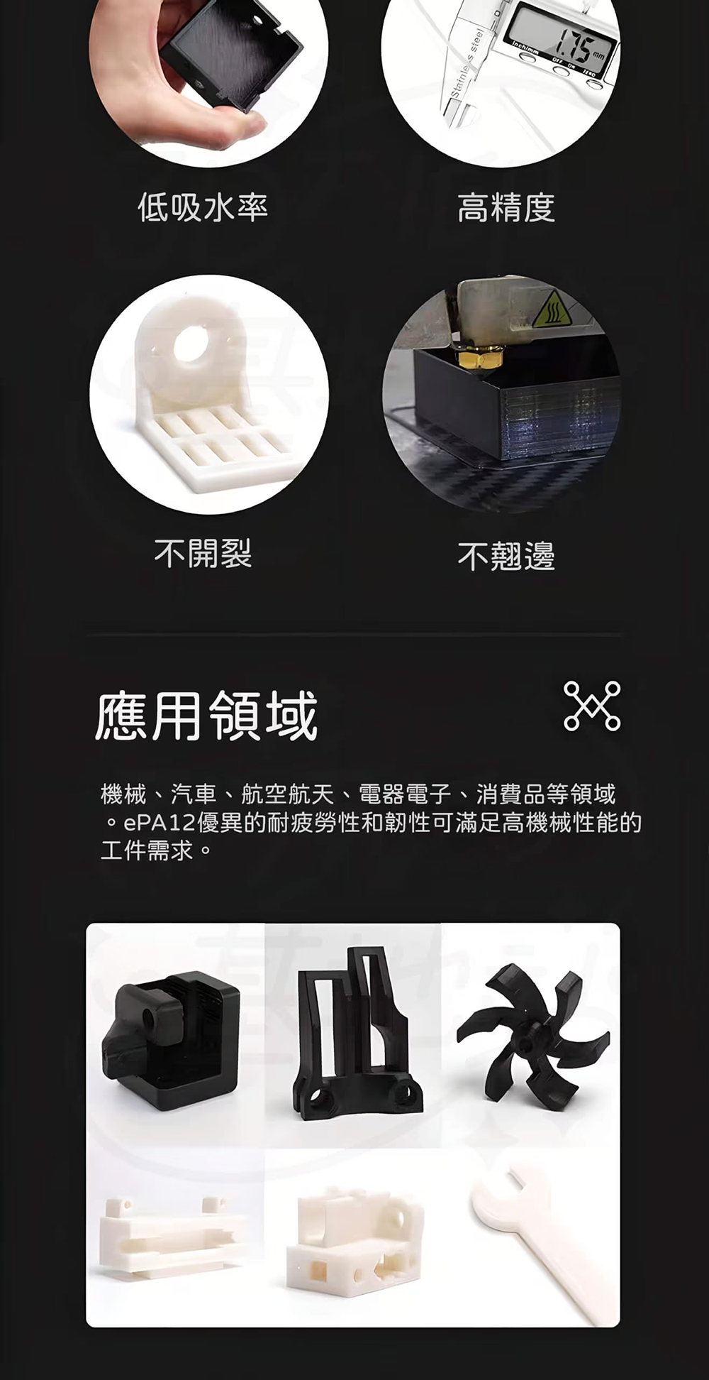 PA12(尼龍12)是基於PA12開發的產品;吸水率低,列印的零件尺寸受濕度和溫度的影響較低。 PA12具有高韌性,高抗衝擊性,可用於列印耐用零件;具有高達165%的斷裂伸長率和優異的抗疲勞性;自潤滑耐磨性能,可列印機械齒輪;高耐溫性能,熱變形溫度100℃,可用於耐溫零件;低收縮率,列印時不易翹邊和開裂。