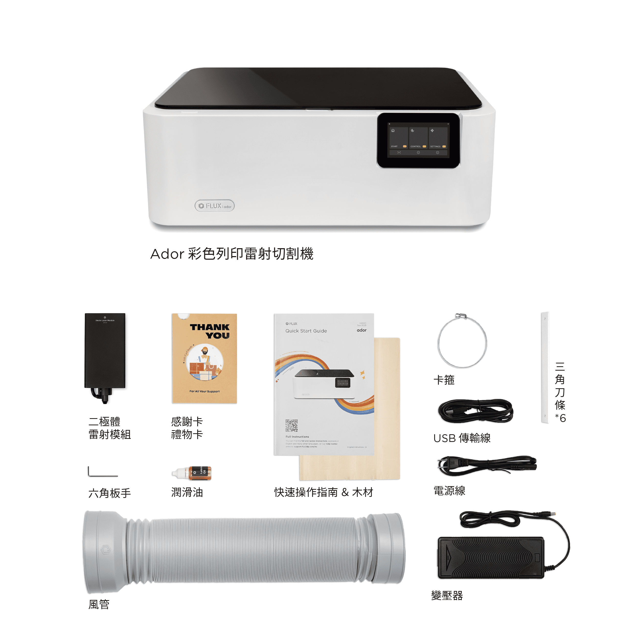 『雕、切、印』可選購10W或20W的二極體雷射主機,並依需求自由加購『彩色列印模組』和『各式金屬雕刻模組』來作結合的世界首創3合1雷射切割機ador,內建自動對焦系統,5吋直覺觸控面板,8MP高解析度預覽相機,全版金封閉式設計,降低雷射強光對眼睛的傷害,若遇外部開蓋干擾,機器會立即停止,讓使用者安全有保障。
