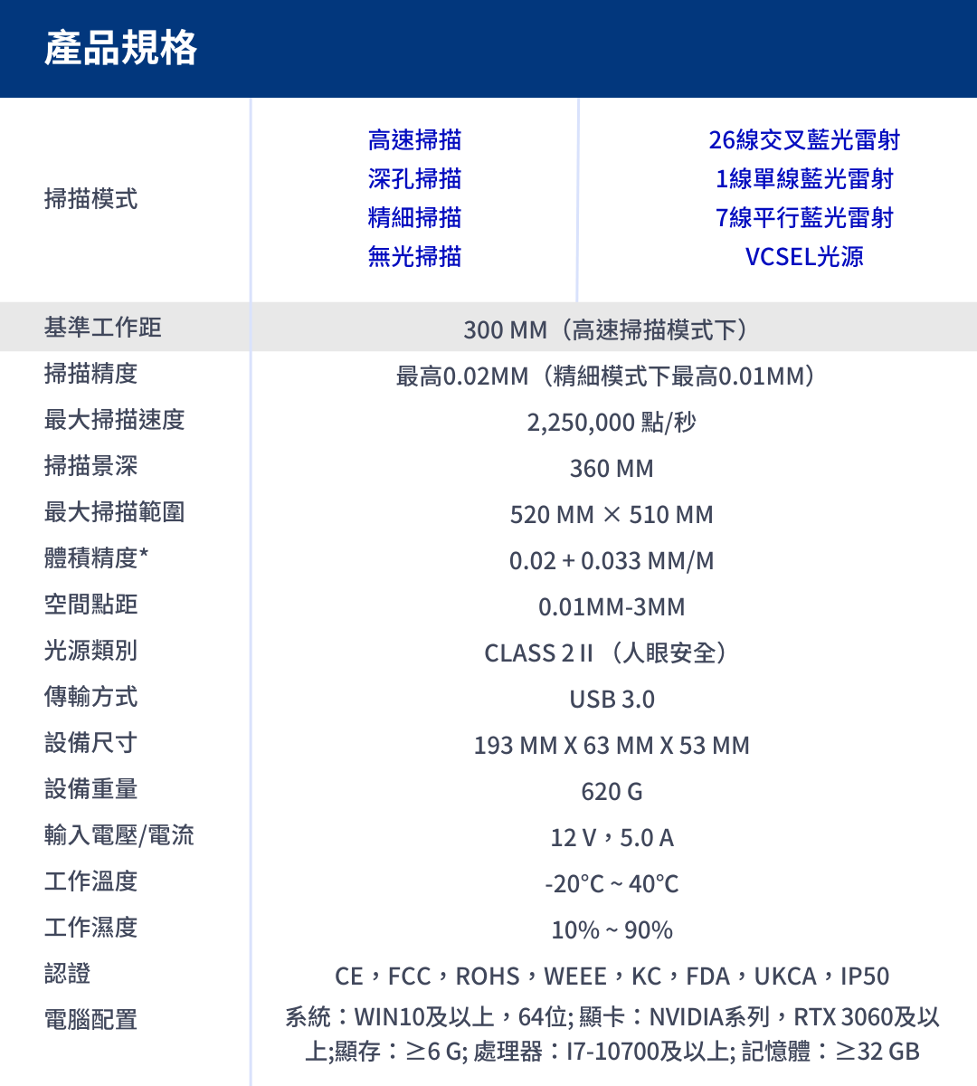 FreeScan Combo 計量級雙光源手持3D掃描器,擁有兩種光源、配備四種模式:藍色雷射(高速掃描模式、精細掃描模式、深孔掃描模式);紅外不可見光(VCS EL―無光掃描模式);具有極小尺寸―193x63x53mm、僅重620g。