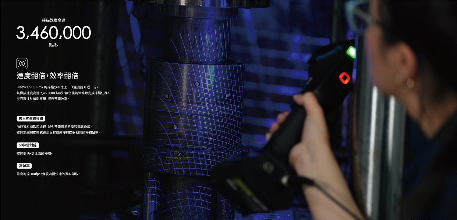 FreeScan UE Pro2 是一款專為量測等級精度打造的無線高精度 3D 掃描器,結合高速掃描與卓越準確度,滿足專業人士對精密量測與檢測的嚴格需求,是工業檢測與工程應用的理想選擇。