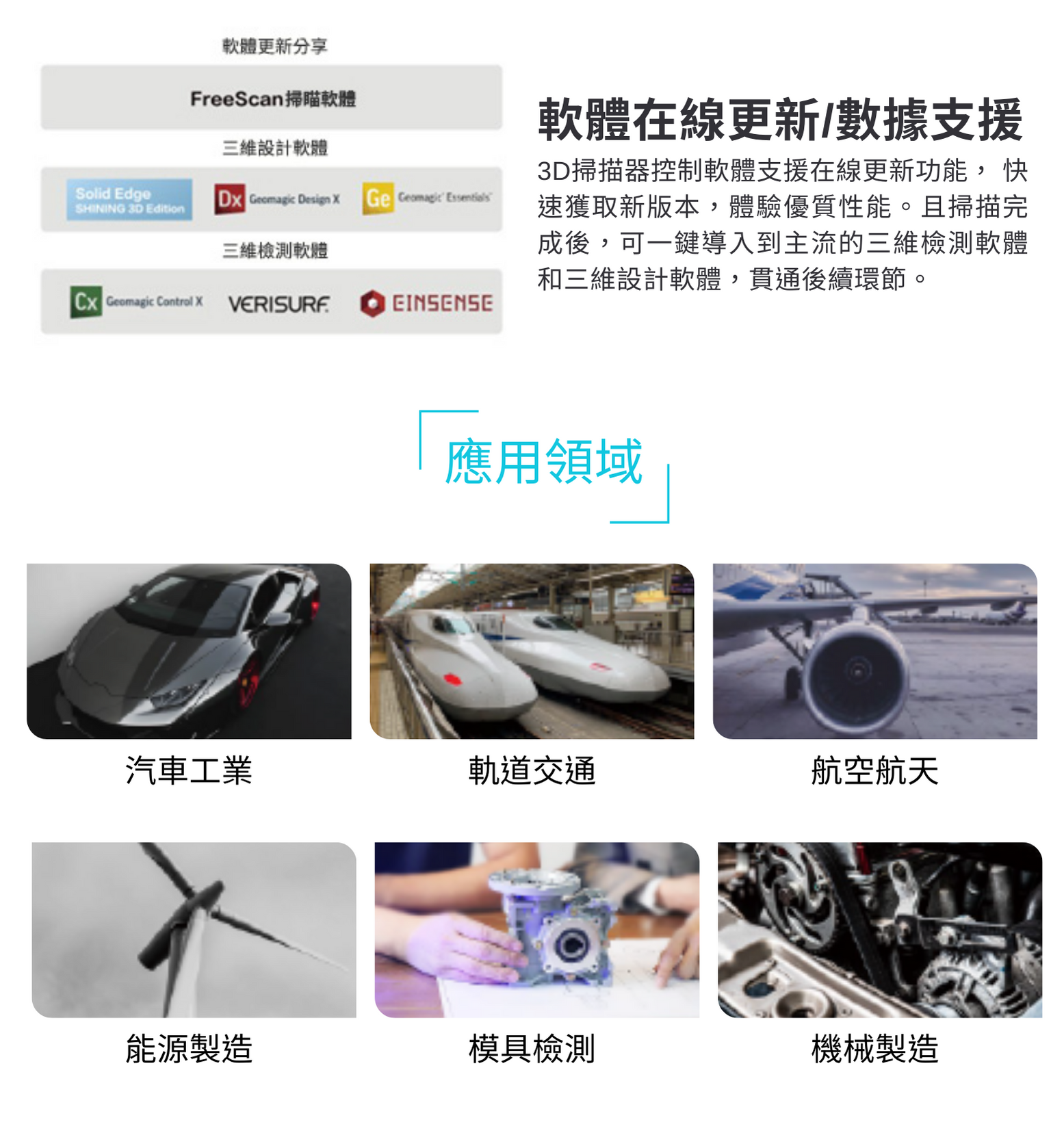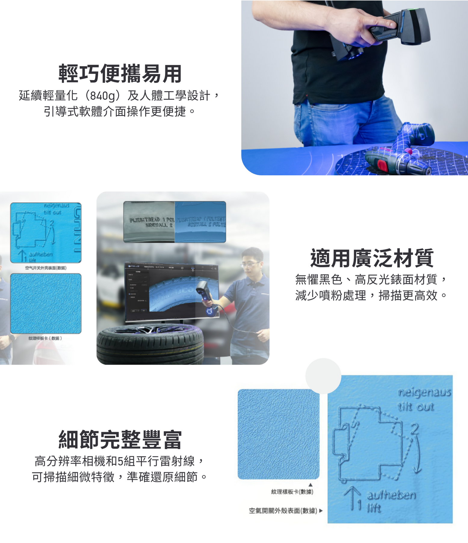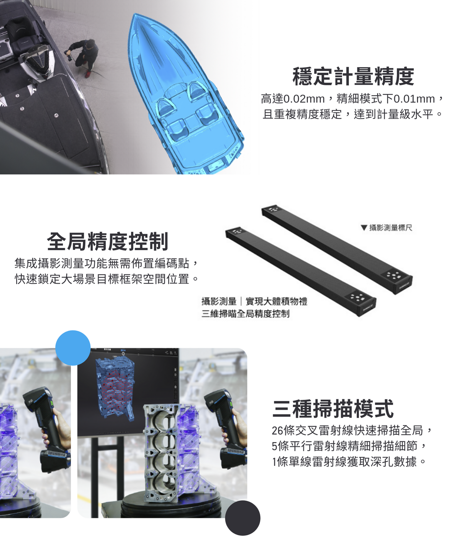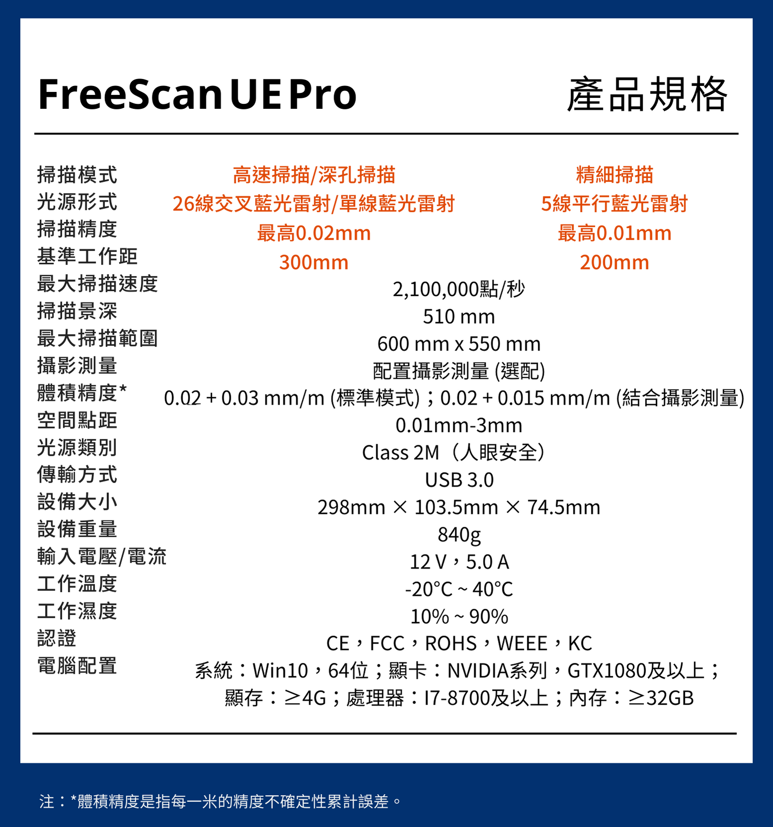 FreeScan UE Pro 繼承 FreeScan UE高精度、穩定的重複精度以及輕量化設計的同時,提升精細掃描以及大型工件掃描全局精度控制的能力,採用26+5+1條藍光雷射線組合併集成攝影測量模塊,兼顧速度、精度和細節,將為用戶提供可適用不同尺寸掃描場景的技術方案,進行計量級精度檢測、逆向設計、增材製造及其他應用。