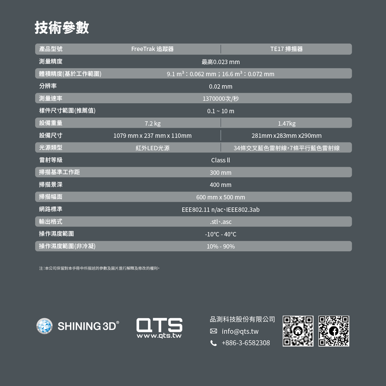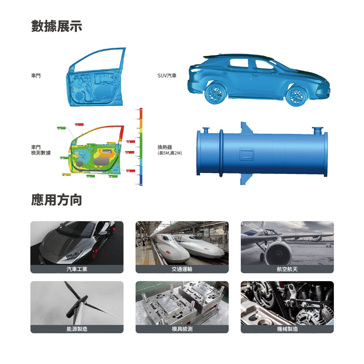 FreeScan Trak Pro 追蹤式雷射掃描系統,由Shining 3D自主研發,使用特色技術可通過光學追蹤器實時追蹤定位掃描頭的空間位置,來獲取大中型樣件完整準確的3D數據。掃描時無需貼點,節省大量時間,其適用於航空航天、汽車工業、軌道交通、能源領域等製造 業的中大型3D掃描靜態/動態場景。