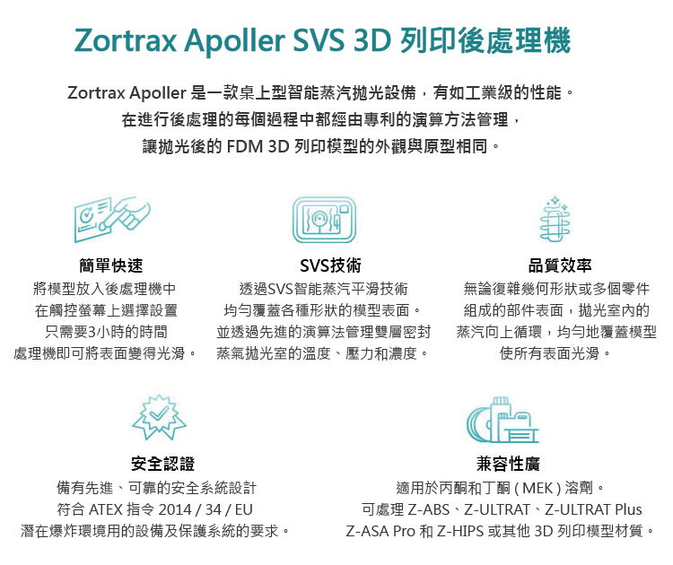 Zortrax Apoller使用Zortrax SVS(智能蒸汽拋光)技術與丙酮和甲乙酮(MEK)配合使用。 智能蒸汽拋光處理技術(SVS)使用專利的演算法來管理Apoller後處理機拋光室中溶劑蒸汽的溫度,壓力和濃度。首先,拋光室會加熱到足以蒸發在玻璃托盤下方水槽中的溶劑。然後通過螺旋向上循環的蒸汽,讓模型表面均勻光滑。接下來,拋光室開始升溫讓模型乾燥。最後,將剩餘的溶劑吸回溶劑槽中。無論放置了多少模型在拋光室中,整個過程需要3小時。完成SVS程序後不久,模型就可以使用了。 |