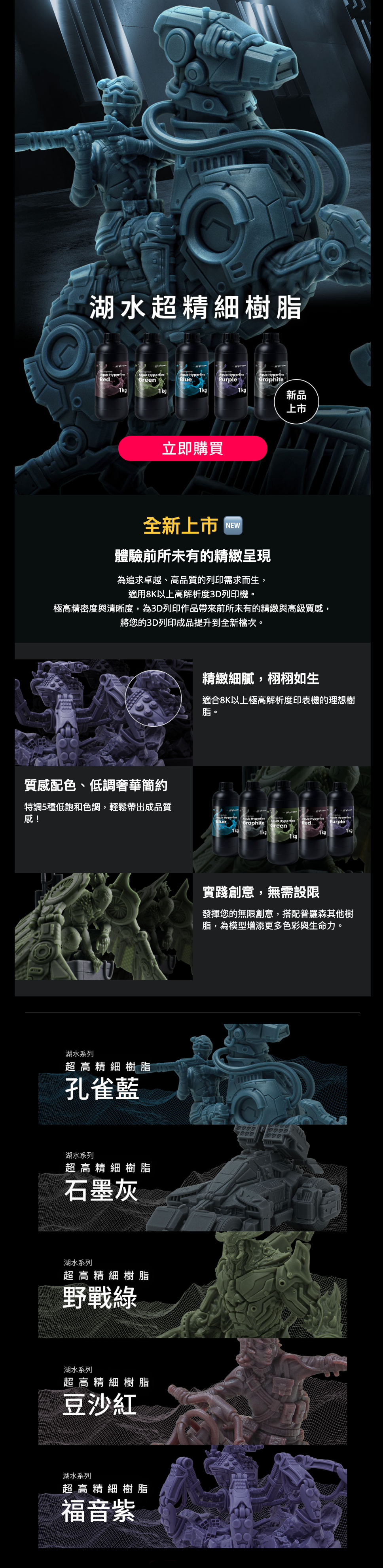 追求卓越、為高品質要求的3D列印需求而生,Aqua 超精細樹脂適用於8K以上高解析度列印機。極高精密度與清晰度,為您的3D印刷作品帶來前所未有的精緻與高級質感。