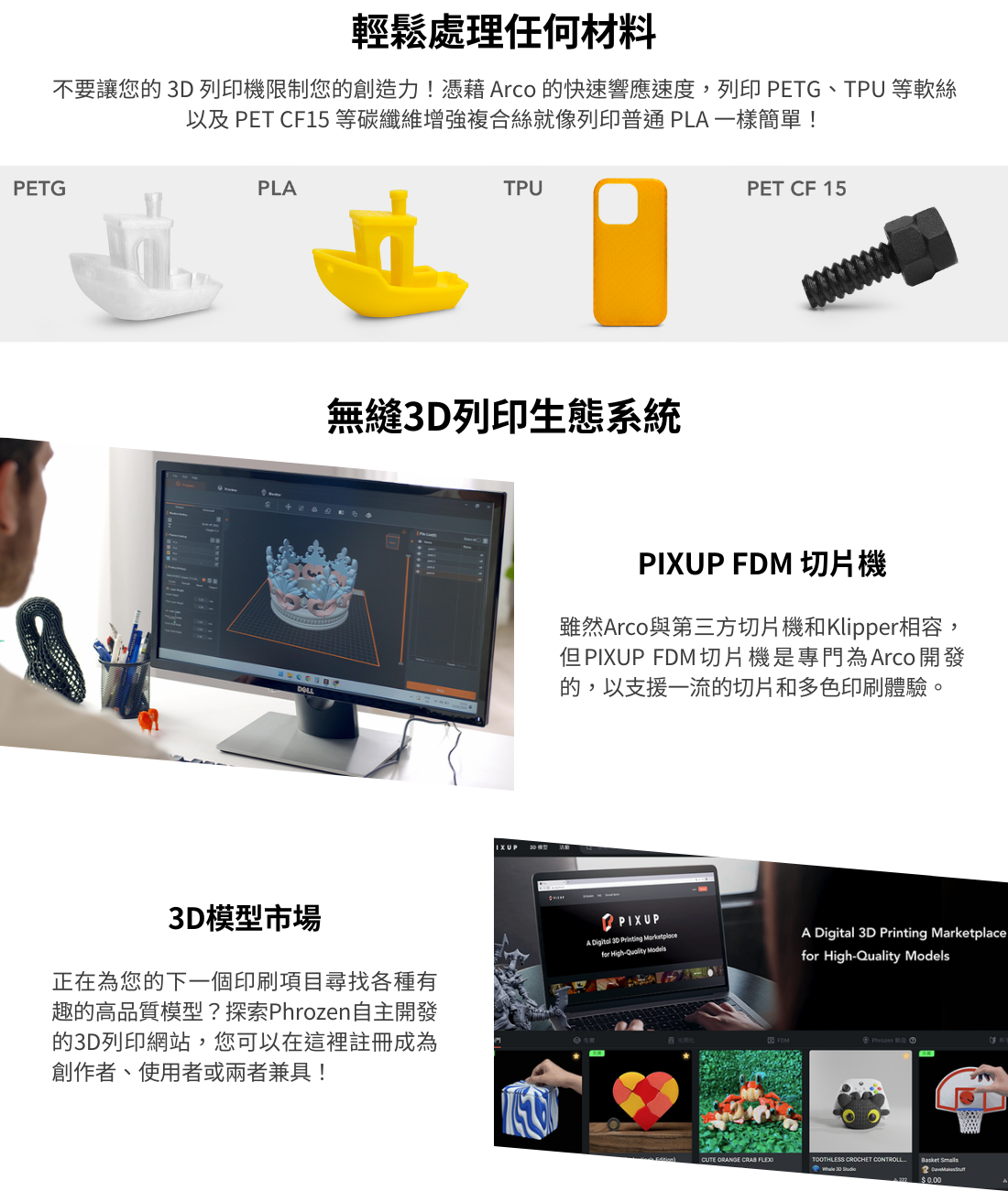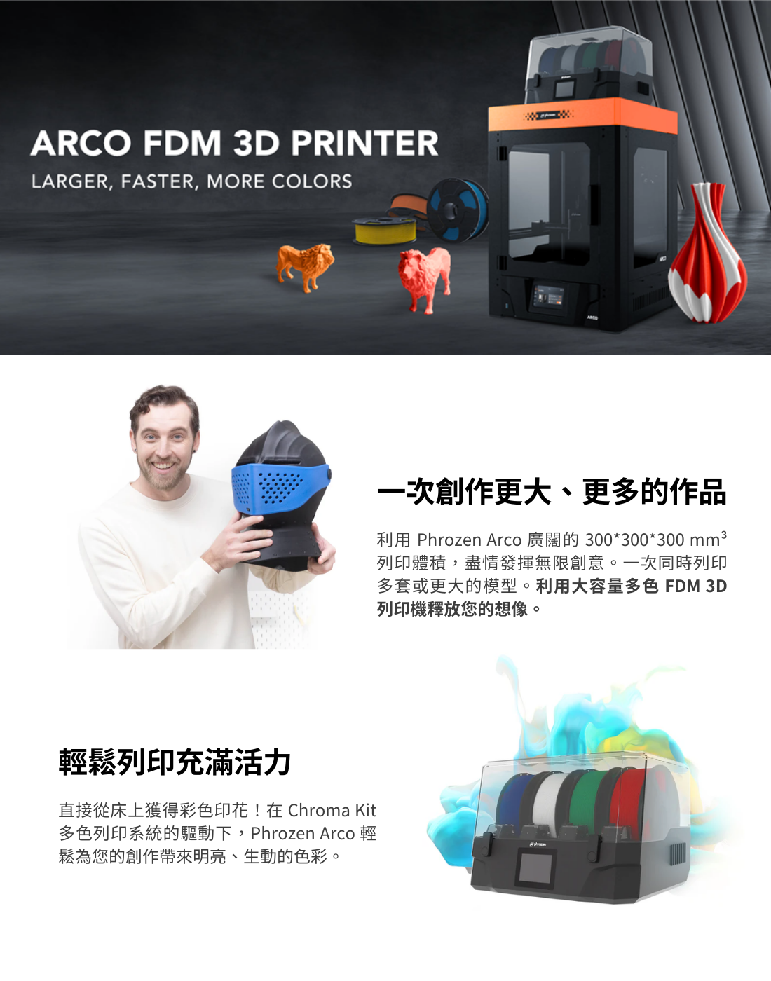 Phrozen Arco 是台灣 Phrozen 推出的高階 FDM 3D 列印機,具備 300×300×300mm 大尺寸列印空間與最高 1,000mm/s 高速列印能力。搭載專屬 Chroma Kit 系統,支援最多 4 色列印(未來可擴充至 8 色),大幅提升創作自由度。機構採 CoreXY 結構與 DEP 擠出技術,列印穩定、柔性材料表現優異。支援多種材料如 PLA、TPU、PETG 及碳纖維複合料,並內建 Klipper 韌體、自動調平與震動補償等智慧功能,適合專業創作者與教育應用。