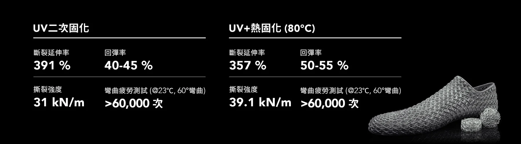 具備50-55%的回彈率,變形後迅速恢復原狀,適用於長期測試與反覆驗證的產品開發過程,確保列印物件耐用持久。
