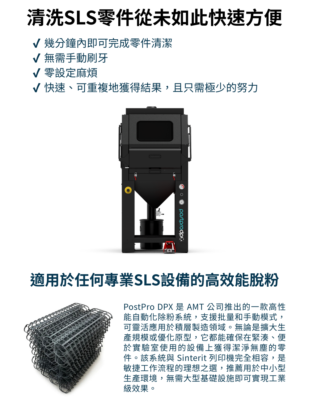 DPX 是 PostPro DP 系列中最緊湊的自動去粉系統,對於使用Formlabs 或Sinterit 等桌面3D列印系統的使用者而言,DPX 提供了安全且節省空間的工業設備替代方案。